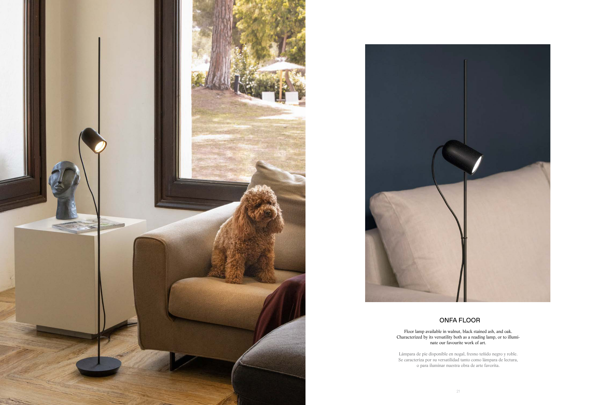 Lámpara de pie disponible en nogal, fresno teñido negro y roble.