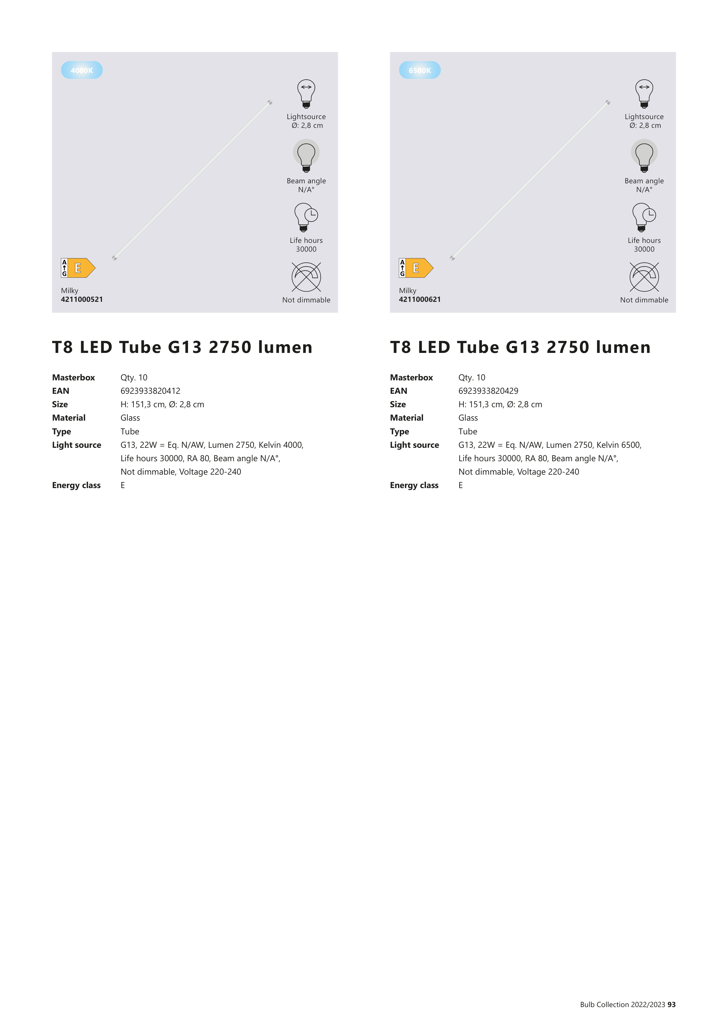 G13, 22W = Eq. N/AW, Lumen 2750, Kelvin 6500,