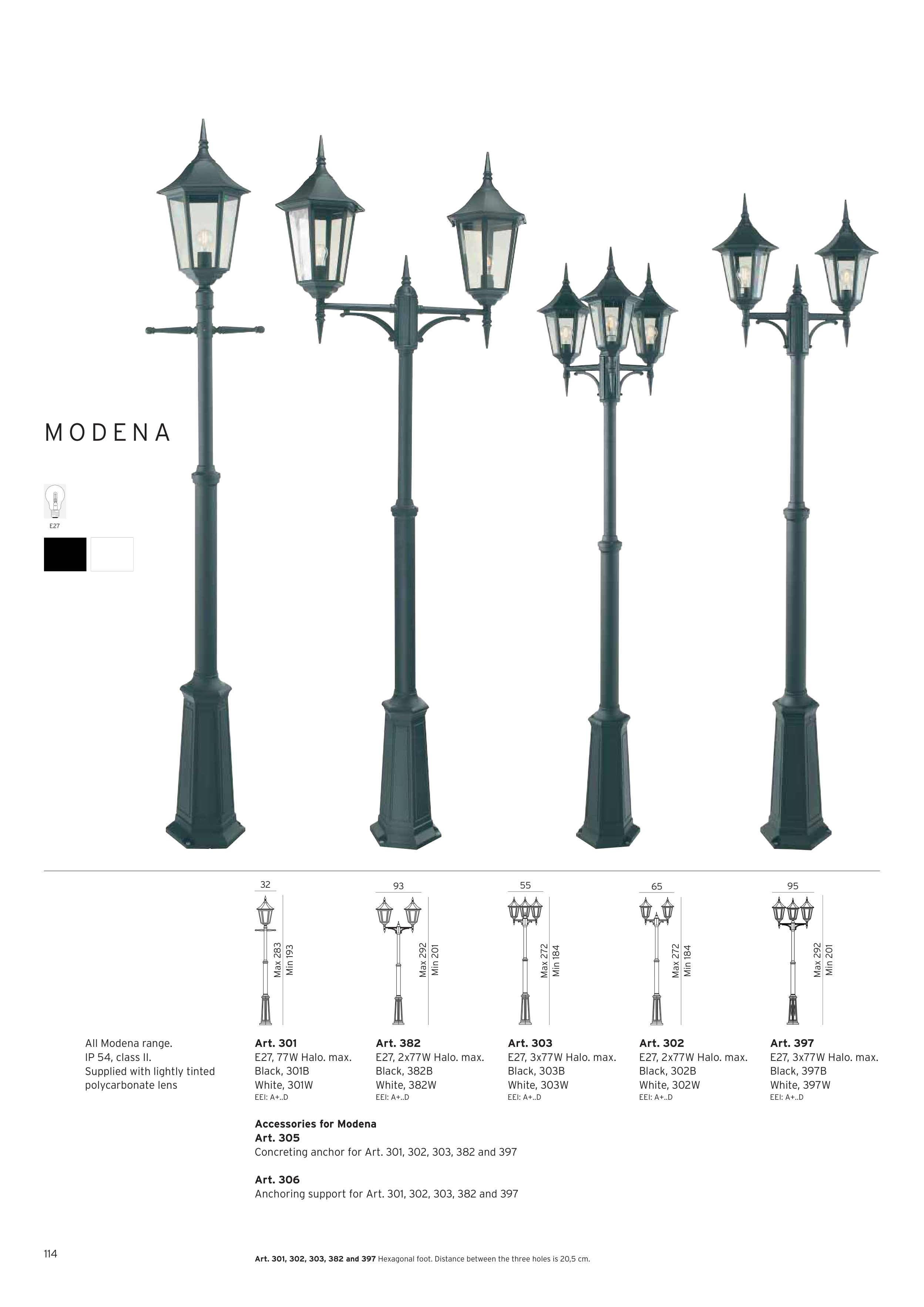 Art. 301, 302, 303, 382 and 397 Hexagonal foot. Distance between the three holes is 20,5 cm.