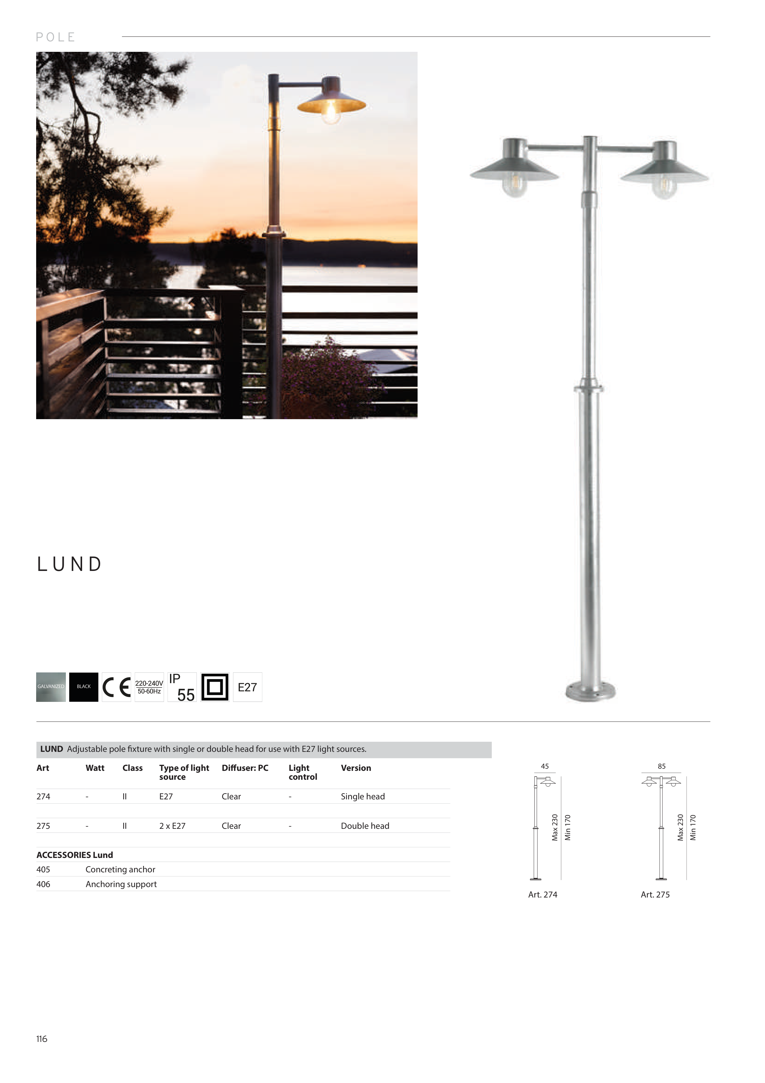 LUND Adjustable pole fixture with single or double head for use with E27 light sources.