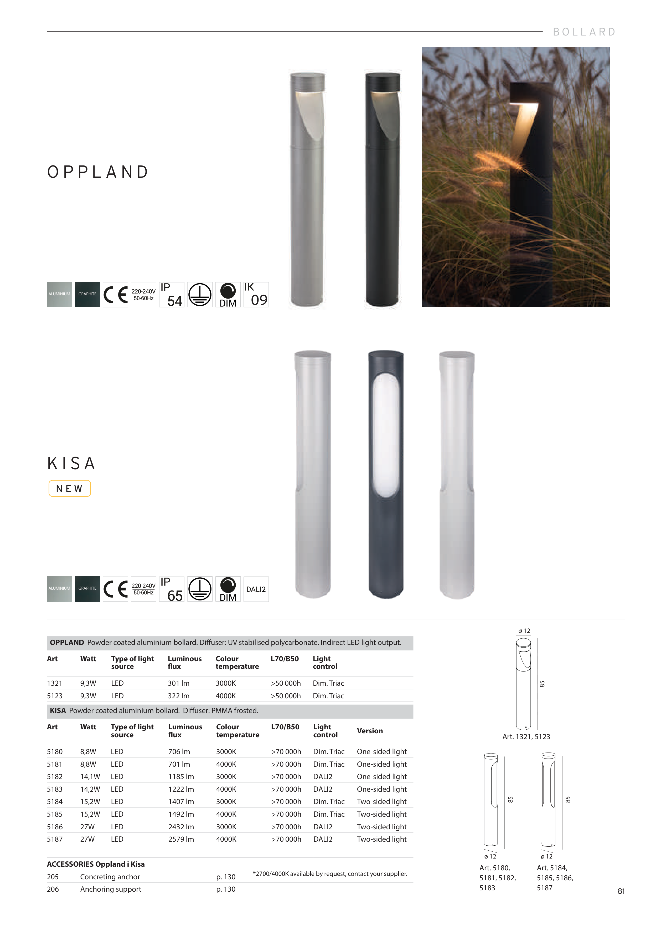 OPPLAND Powder coated aluminium bollard. Diffuser: UV stabilised polycarbonate. Indirect LED light output.