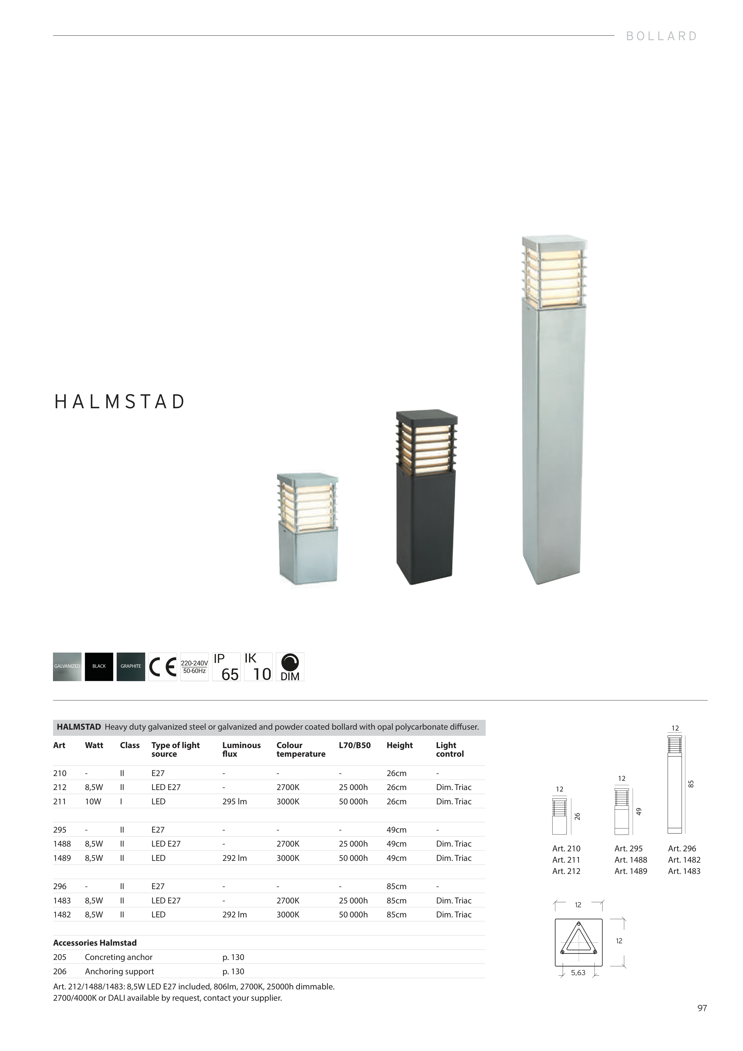 HALMSTAD Heavy duty galvanized steel or galvanized and powder coated bollard with opal polycarbonate diffuser.