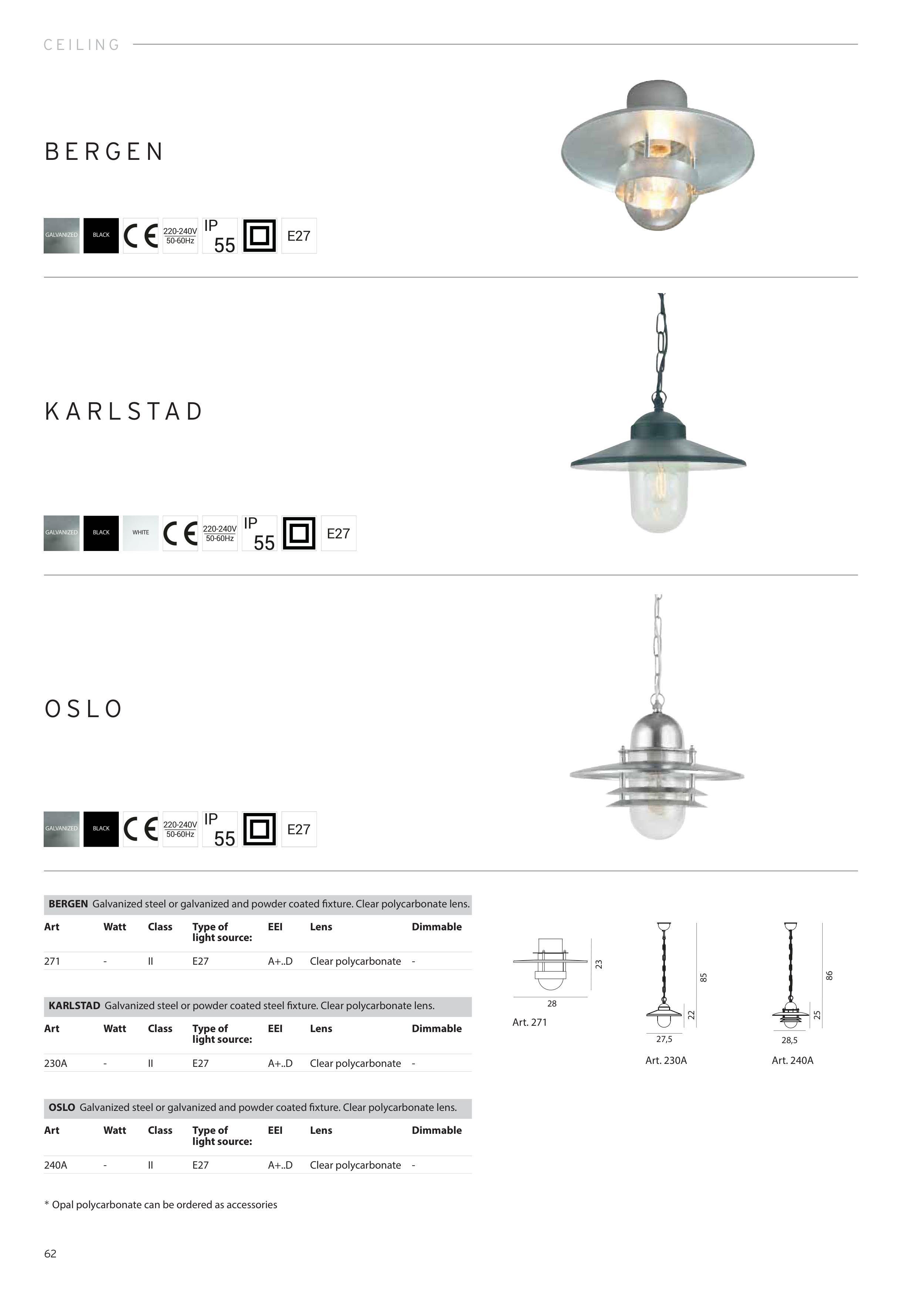 OSLO Galvanized steel or galvanized and powder coated fi xture. Clear polycarbonate lens.