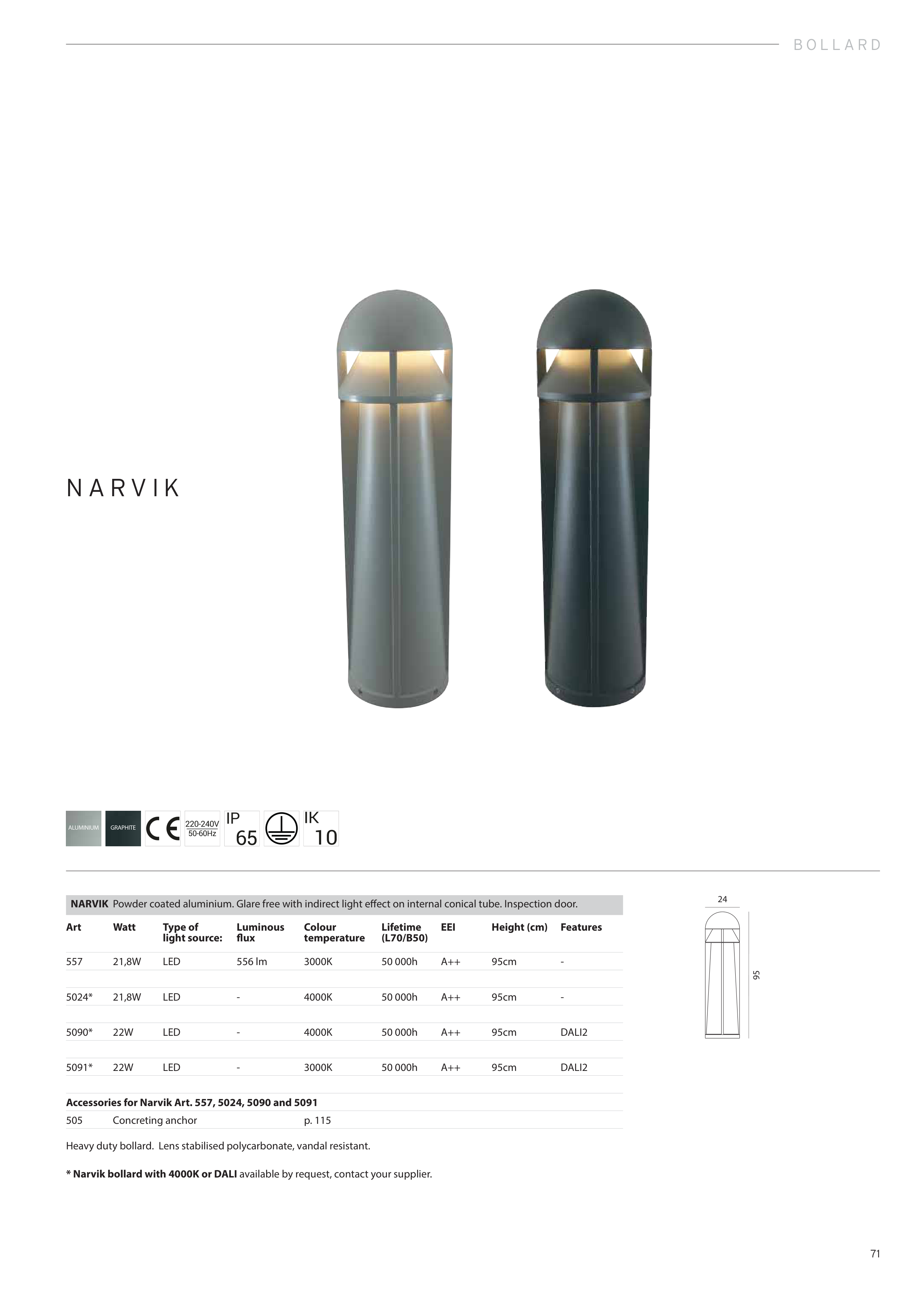 * Narvik bollard with 4000K or DALI available by request, contact your supplier.