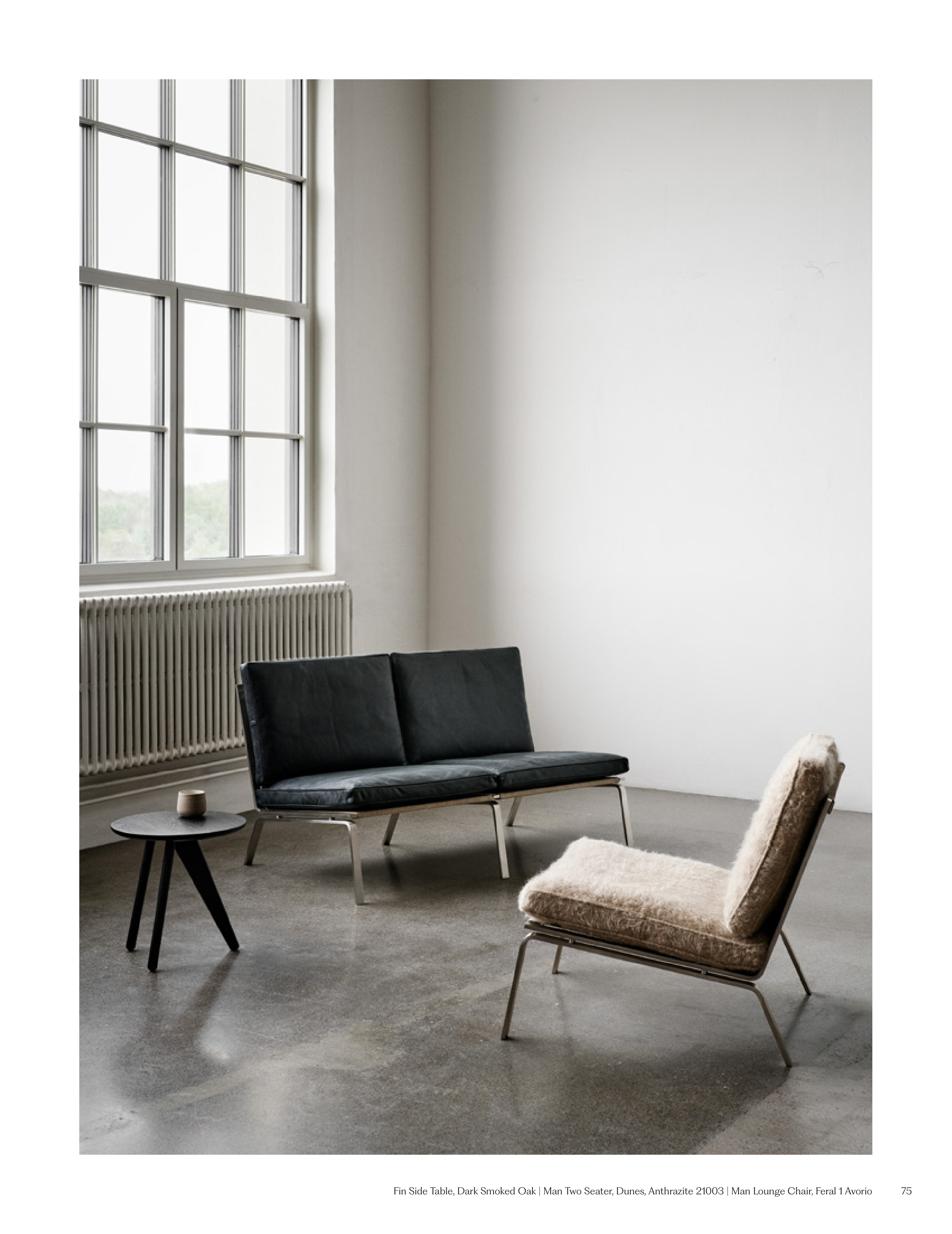 Fin Side Table, Dark Smoked Oak | Man Two Seater, Dunes, Anthrazite 21003 | Man Lounge Chair, Feral 1 Avorio