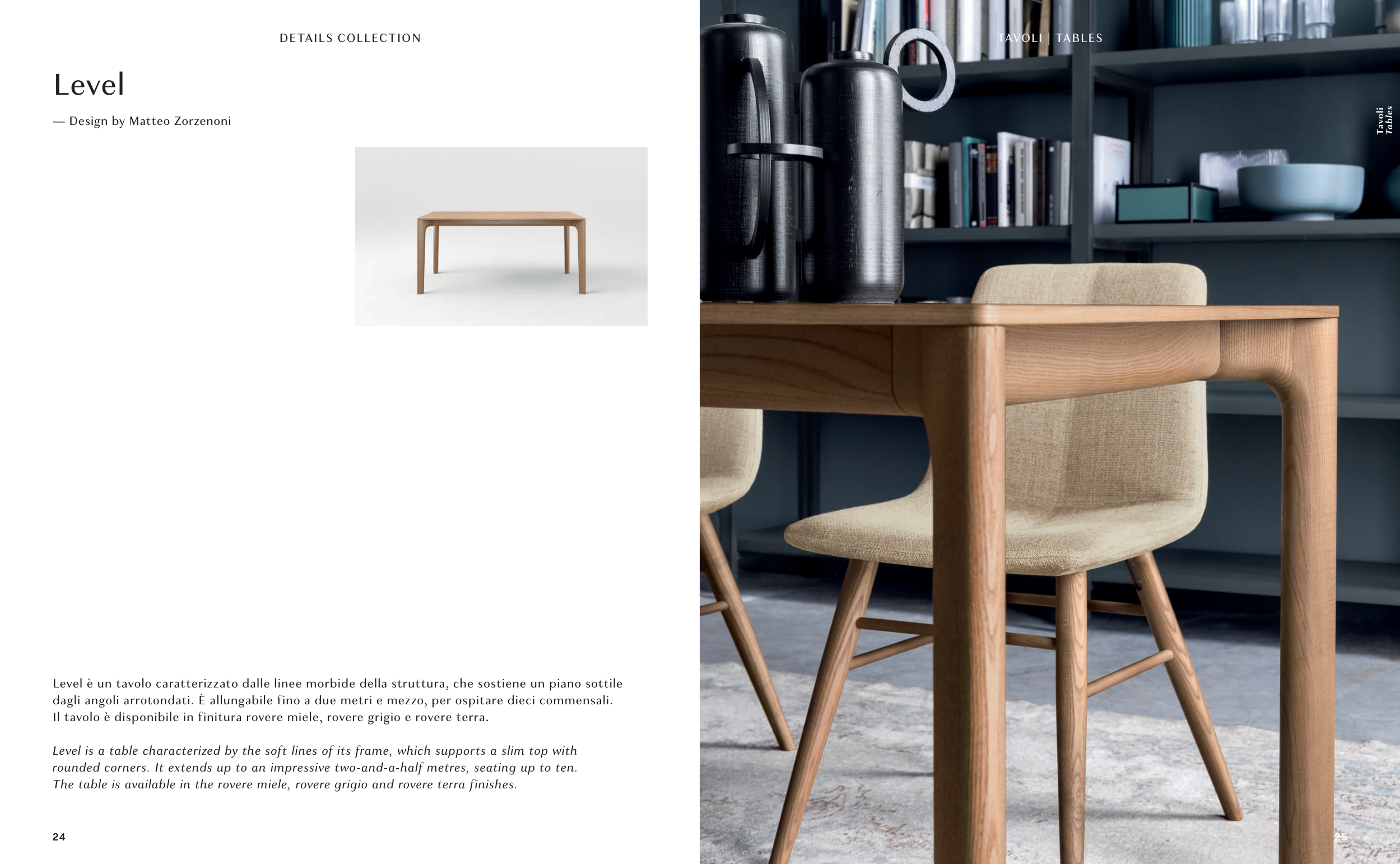 The table is available in the rovere miele, rovere grigio and rovere terra finishes.