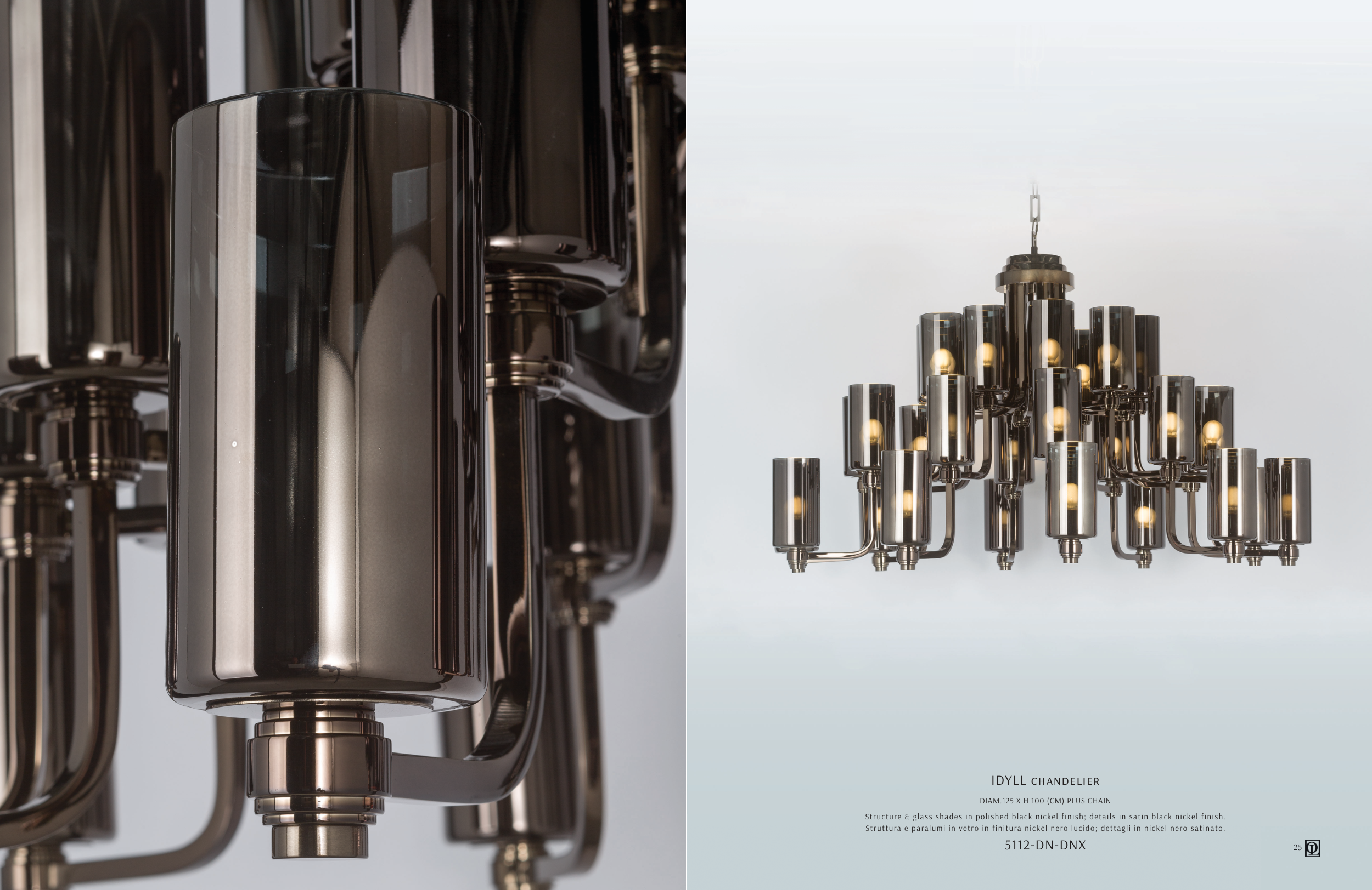 Struttura e paralumi in vetro in finitura nickel nero lucido; dettagli in nickel nero satinato.