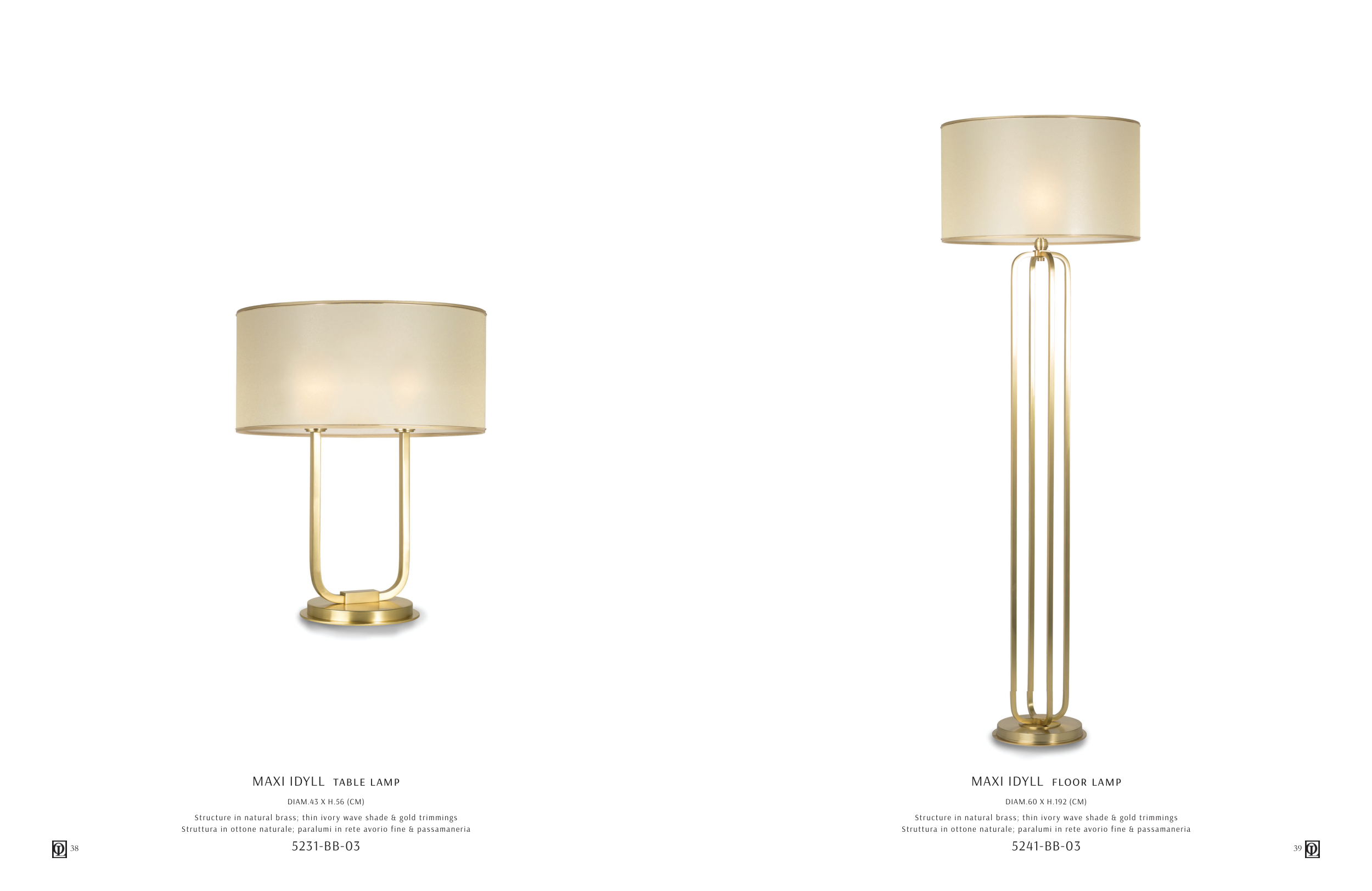 Struttura in ottone naturale; paralumi in rete avorio fine & passamaneria