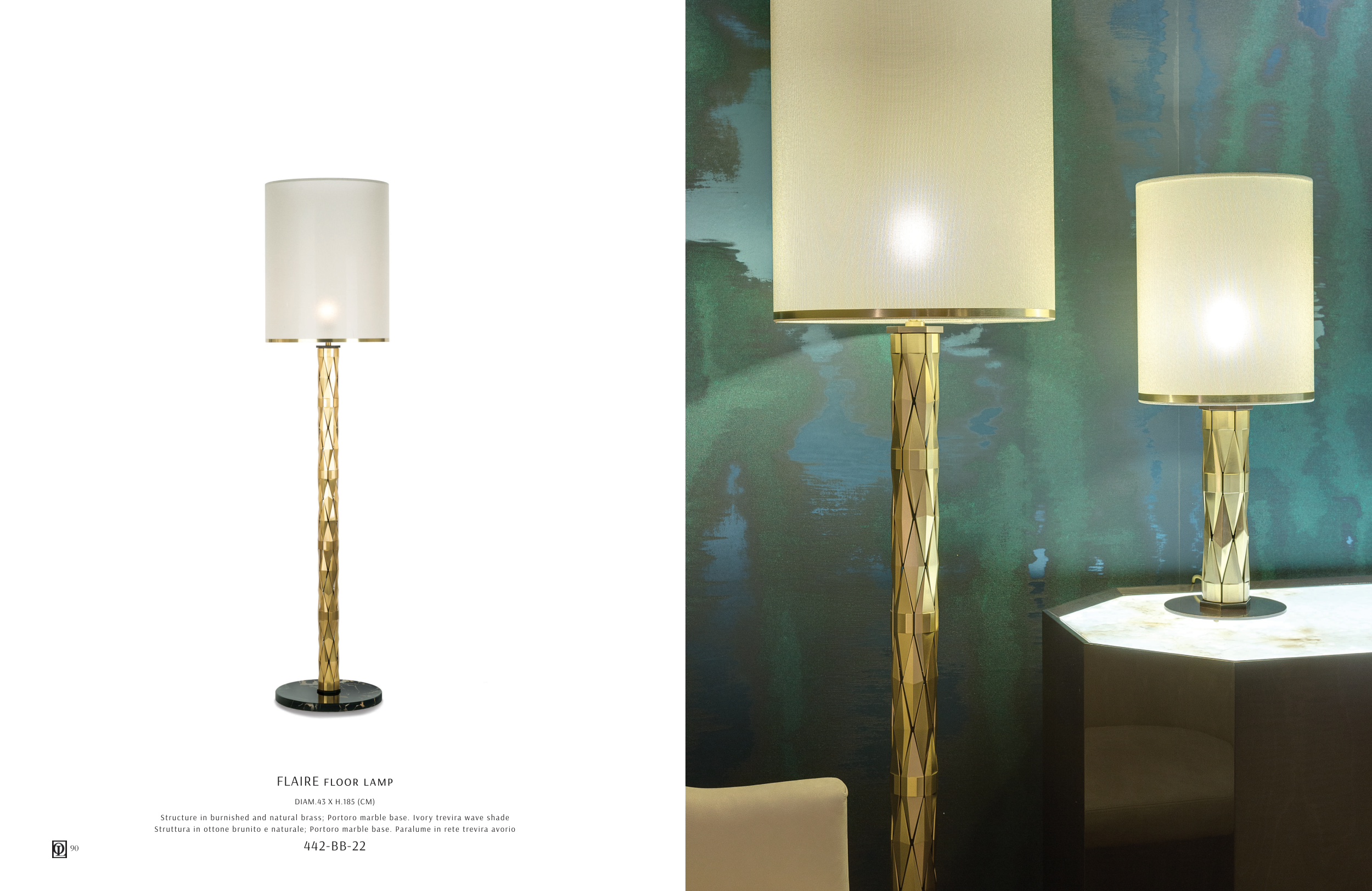 Structure in burnished and natural brass; Portoro marble base. Ivory trevira wave shade