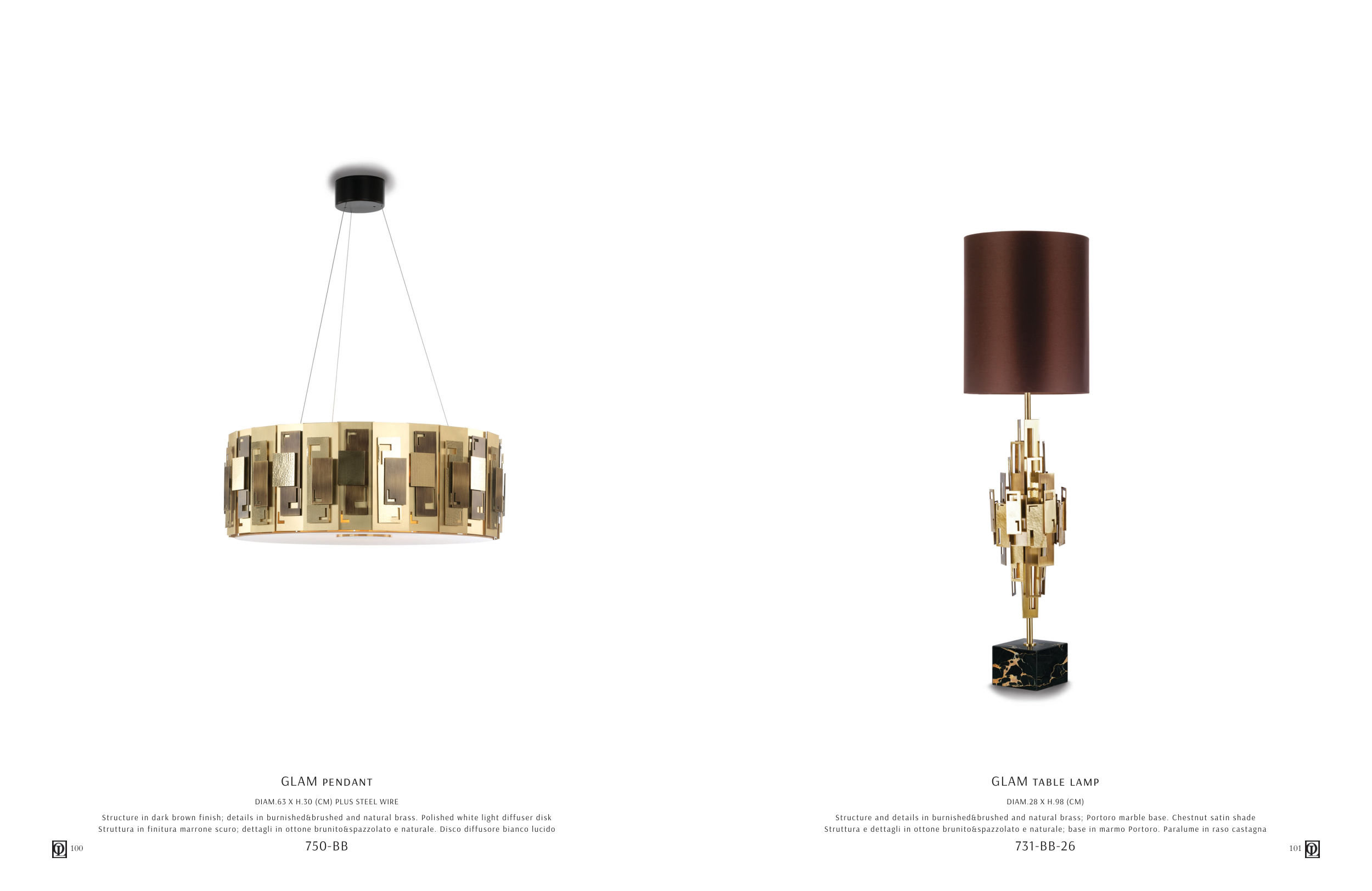 Struttura e dettagli in ottone brunito&spazzolato e naturale; base in marmo Portoro. Paralume in raso castagna