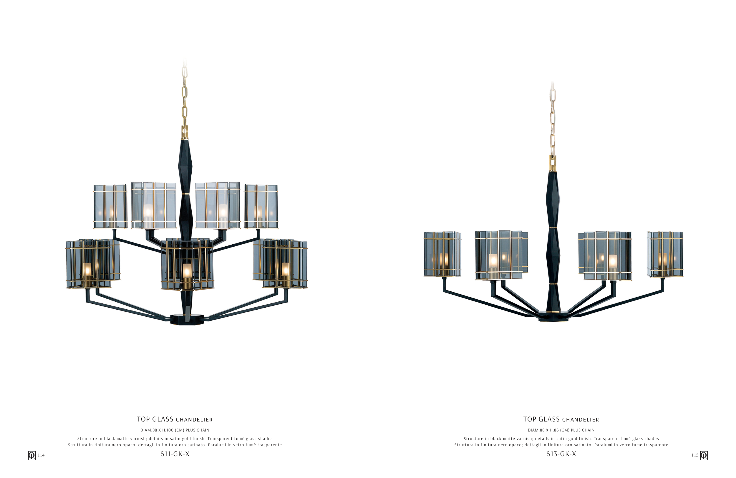 Structure in black matte varnish; details in satin gold finish. Transparent fumè glass shades