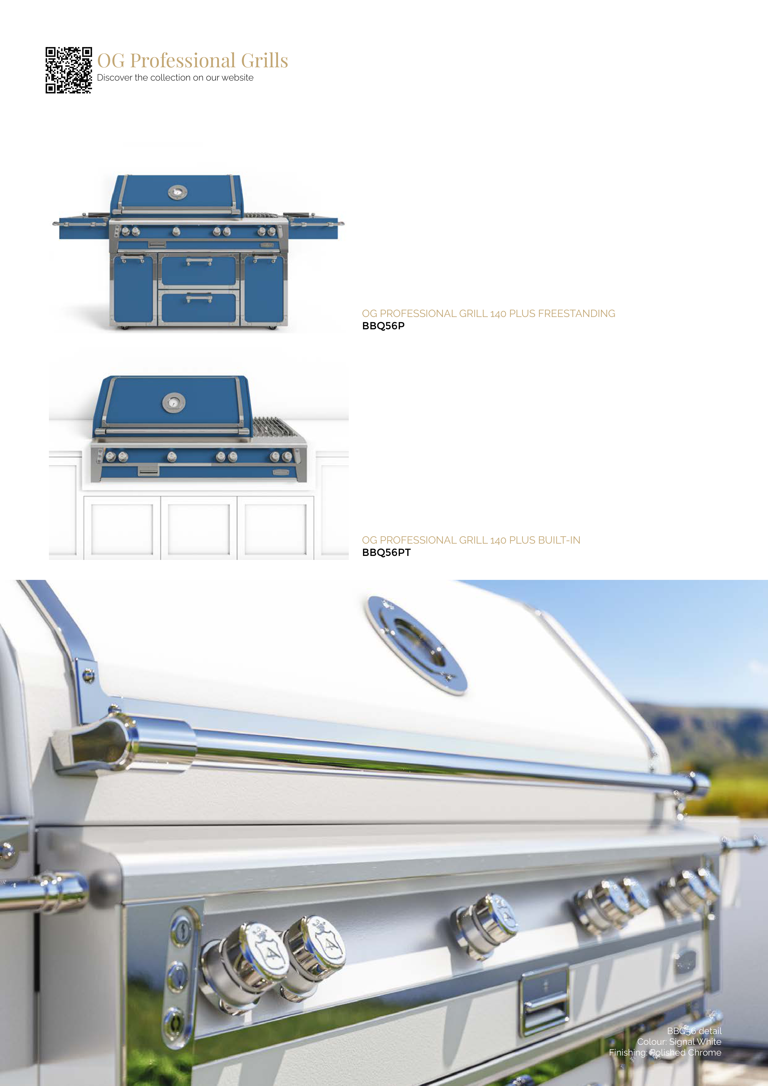 OG Professional Grills Discover the collection on our website OG PROFESSIONAL GRILLS | 133 OG PROFESSIONAL GRILL 140 PLUS FREESTANDING BBQ56P OG PROFESSIONAL GRILL 140 PLUS BUILT-IN BBQ56PT BBQ56 detail Colour: Signal White Finishing: Polished Chrome