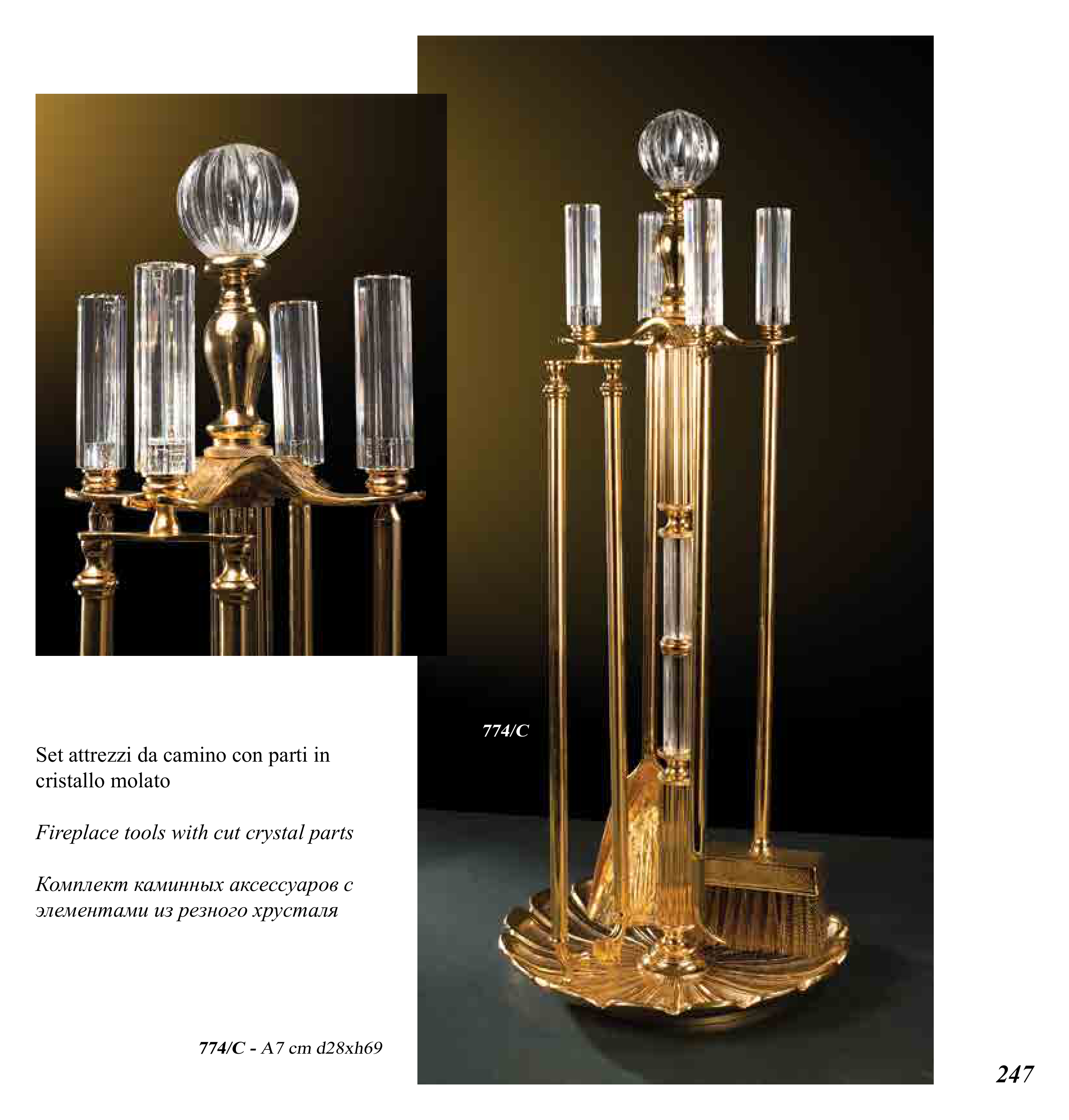 Fireplace tools with cut crystal parts