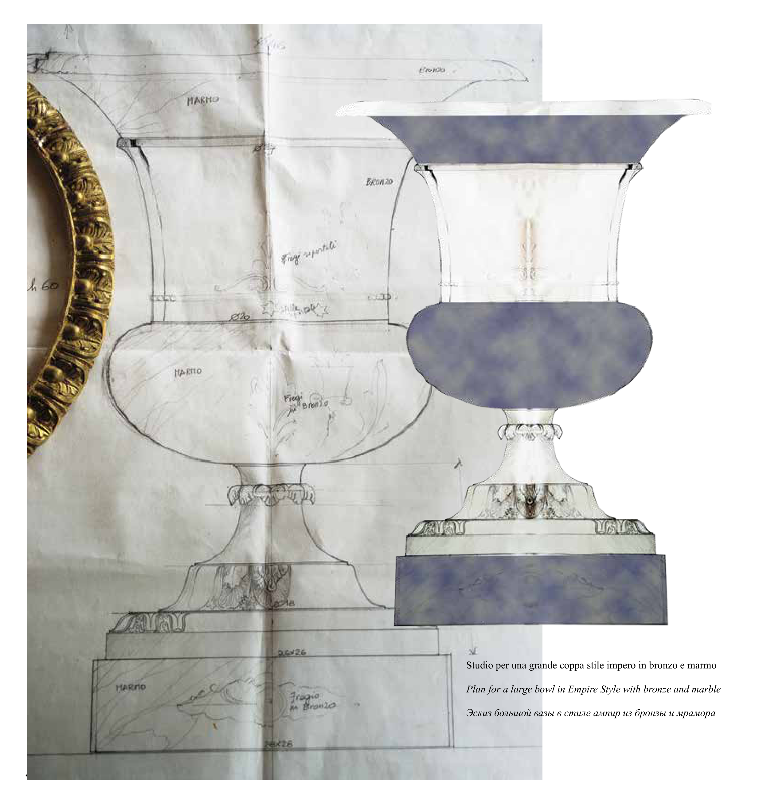 Studio per una grande coppa stile impero in bronzo e marmo