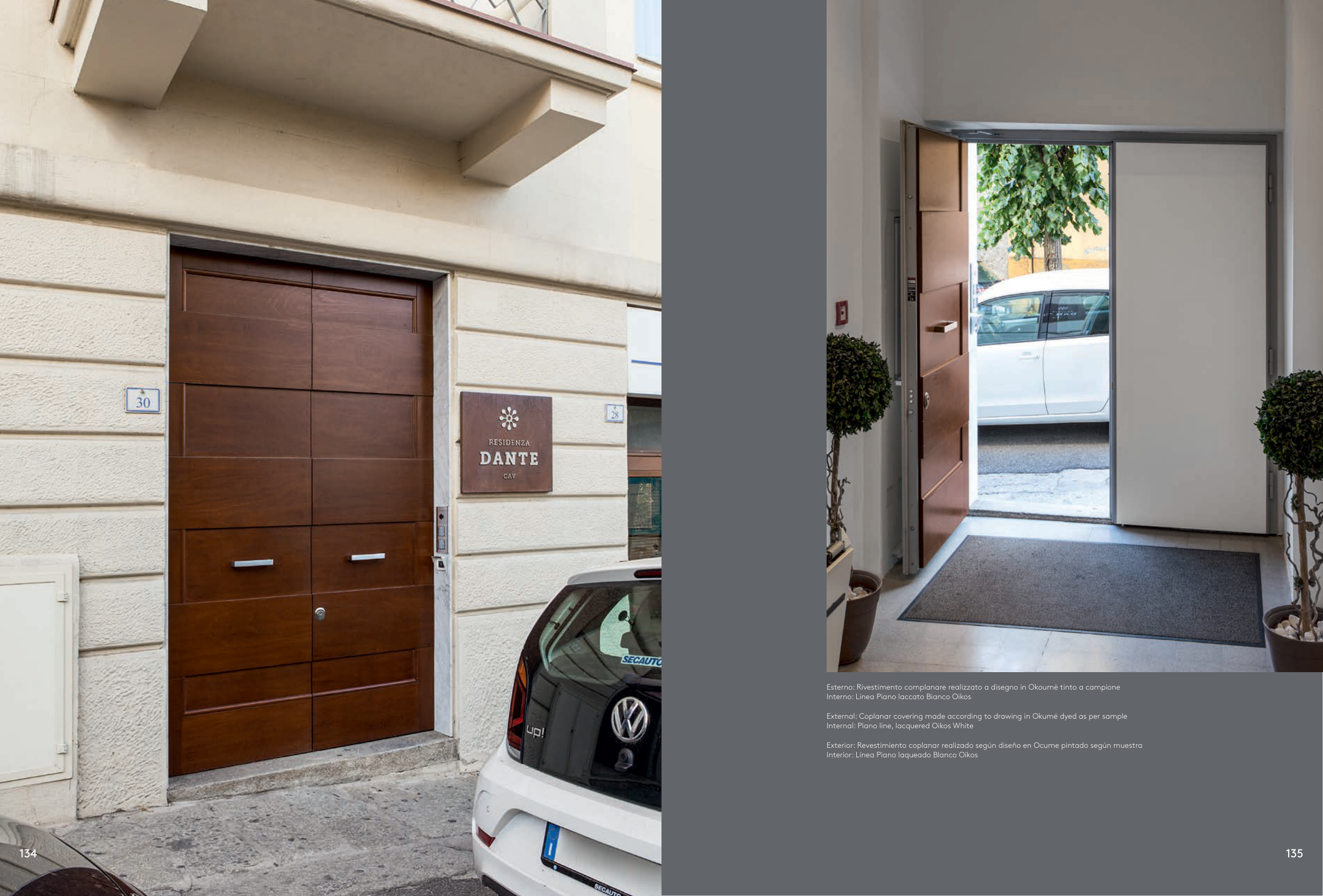 Esterno: Rivestimento complanare realizzato a disegno in Okoumè tinto a campione