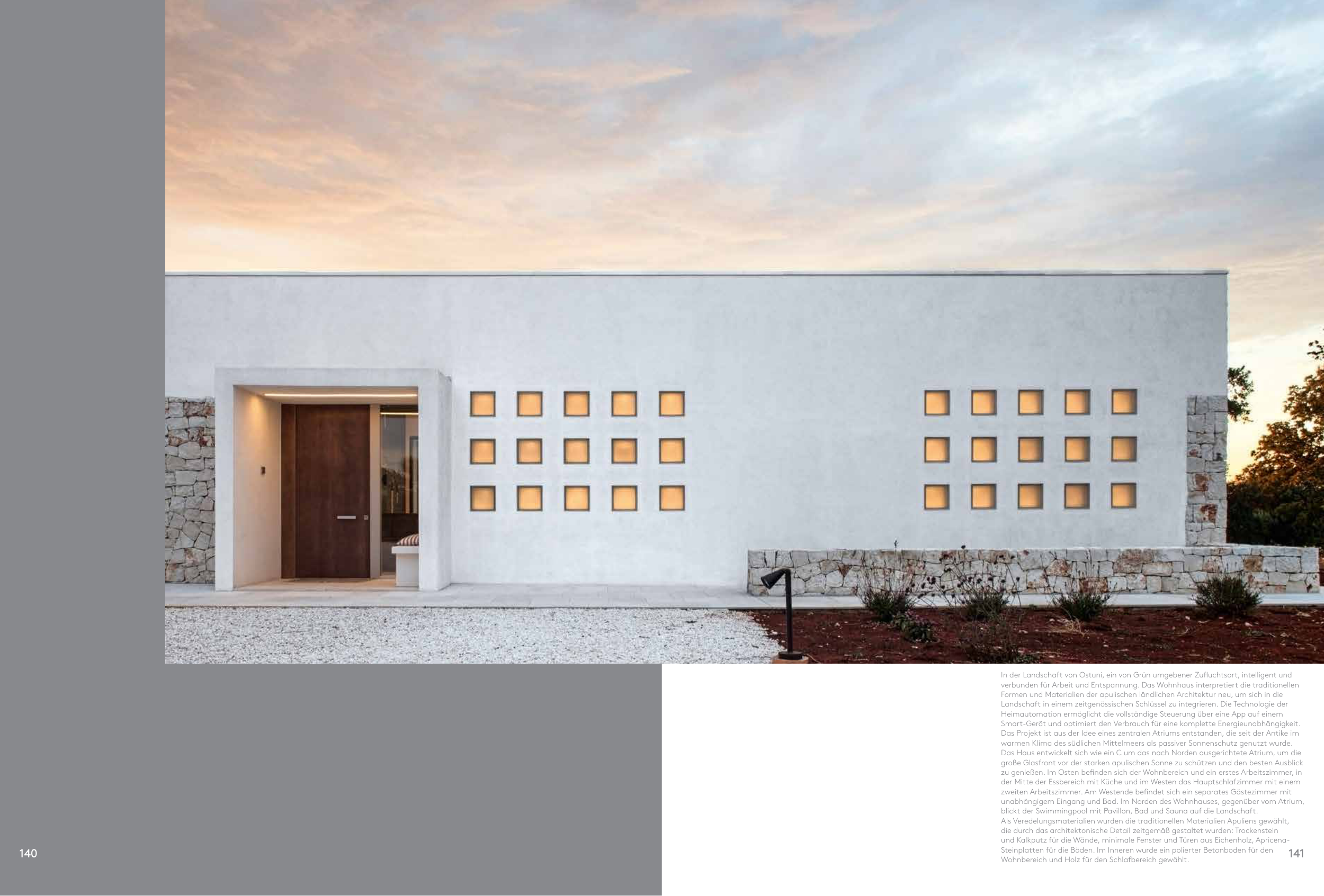 und Kalkputz für die Wände, minimale Fenster und Türen aus Eichenholz, Apricena-