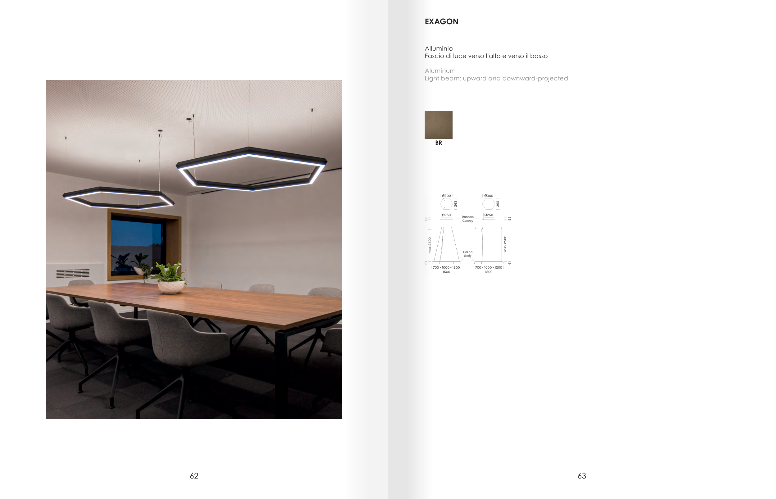 EXAGON Alluminio Fascio di luce verso l’alto e verso il basso Aluminum Light beam: upward and downward-projected BR 971X 972X 61 55 55 61 700 - 1000 - 1200 1500 700 - 1000 - 1200 1500 max 2500 max 2500 Ø250 Ø300 265 265 Ø300 Ø250 Rosone Canopy Corpo Body 63 62