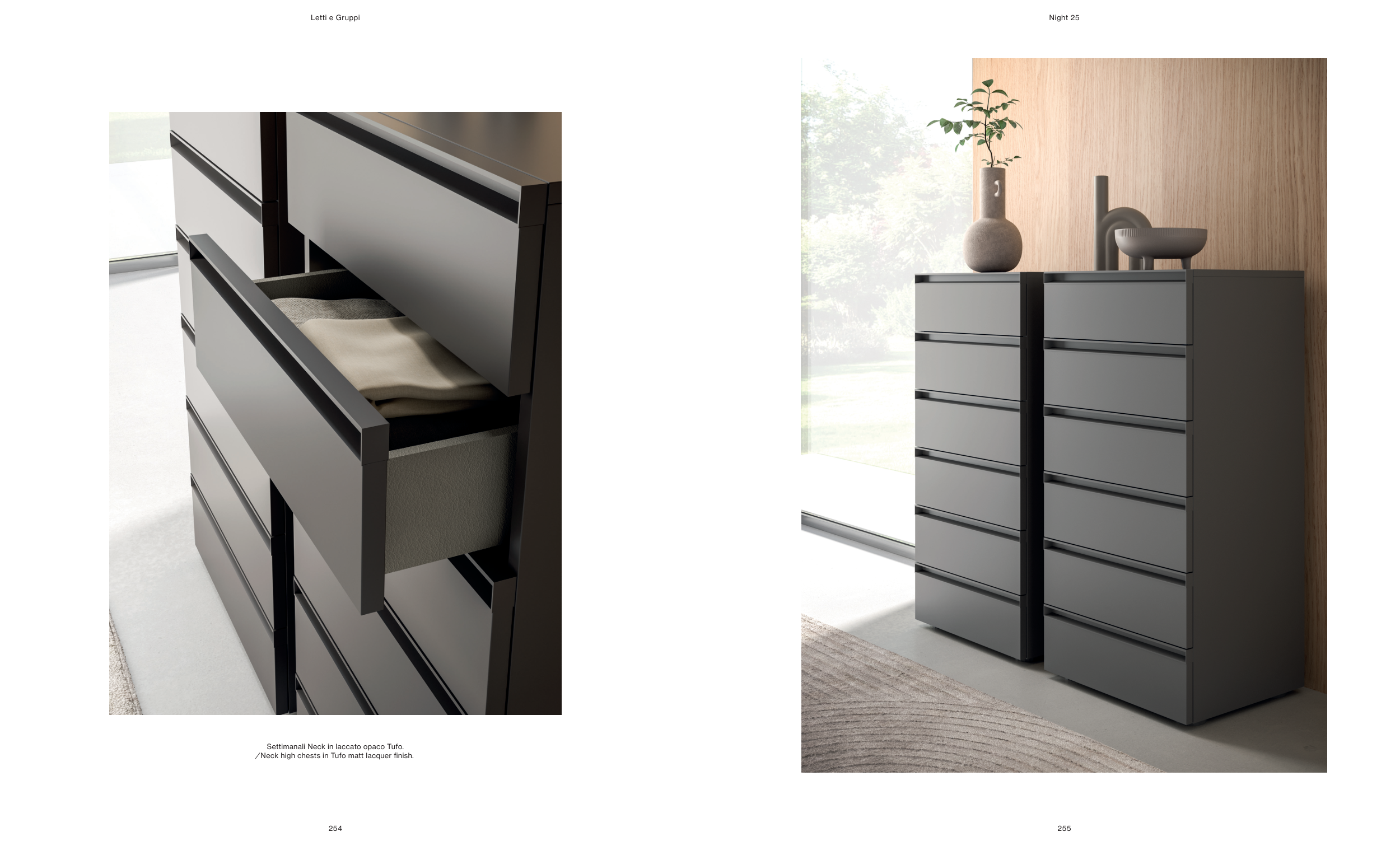 ⁄ Neck high chests in Tufo matt lacquer finish.