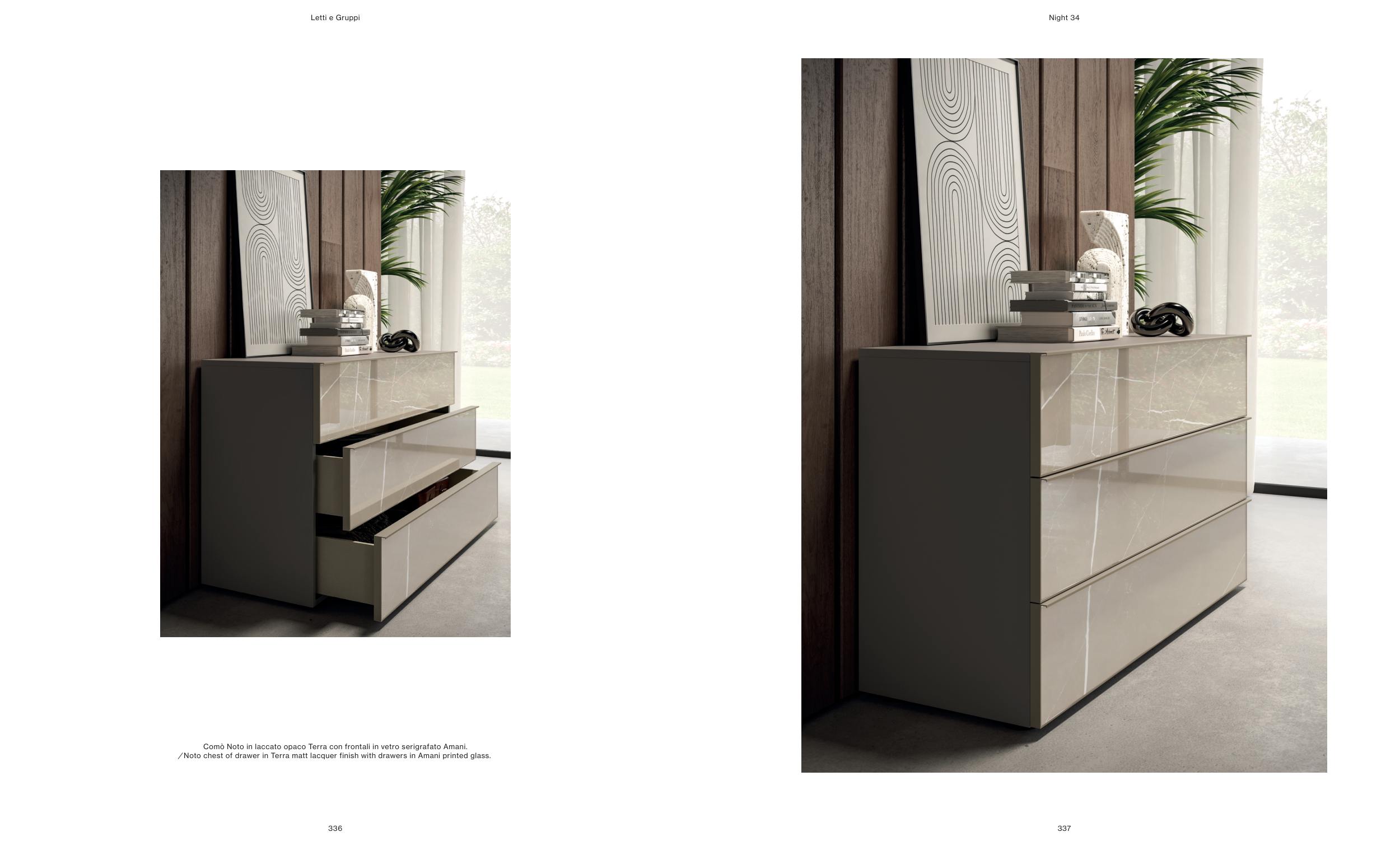⁄ Noto chest of drawer in Terra matt lacquer finish with drawers in Amani printed glass.