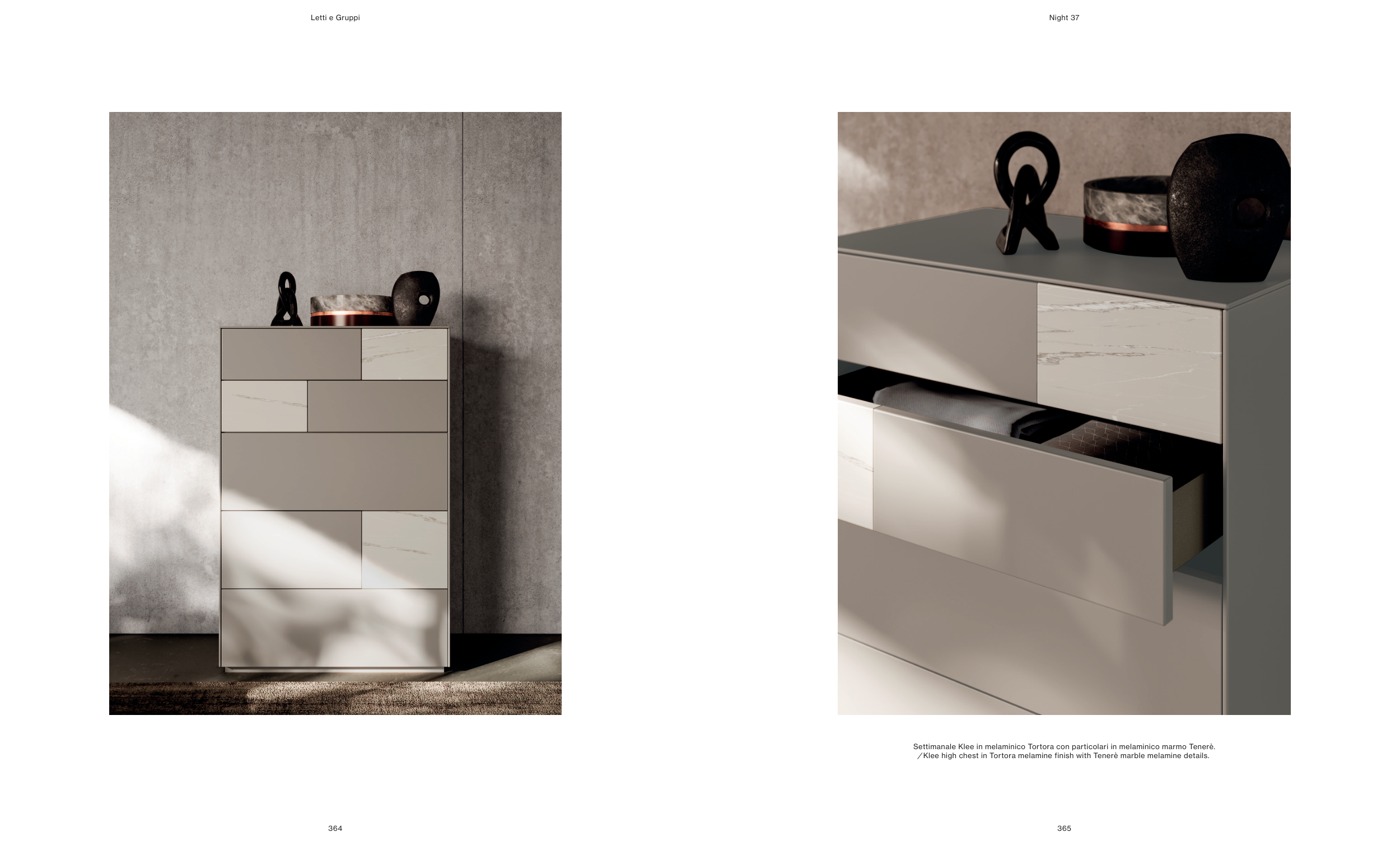 ⁄ Klee high chest in Tortora melamine finish with Tenerè marble melamine details.