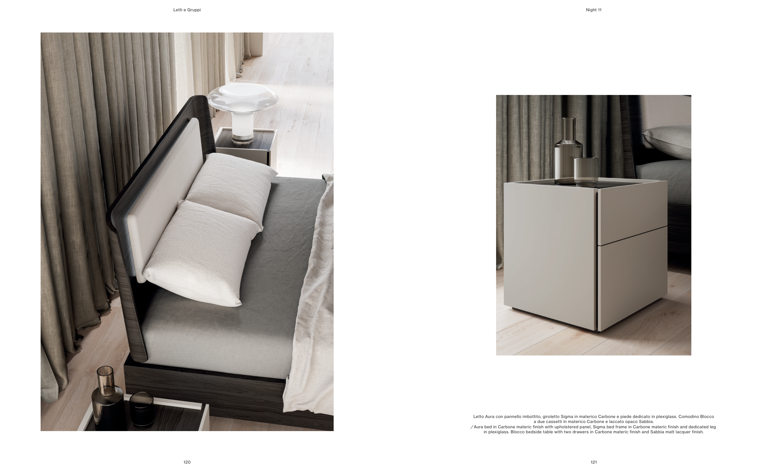 in plexiglass. Blocco bedside table with two drawers in Carbone materic finish and Sabbia matt lacquer finish.