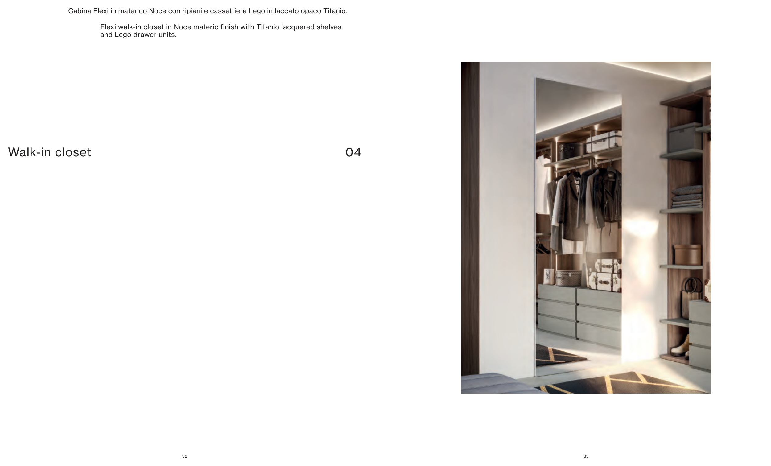 Flexi walk-in closet in Noce materic finish with Titanio lacquered shelves