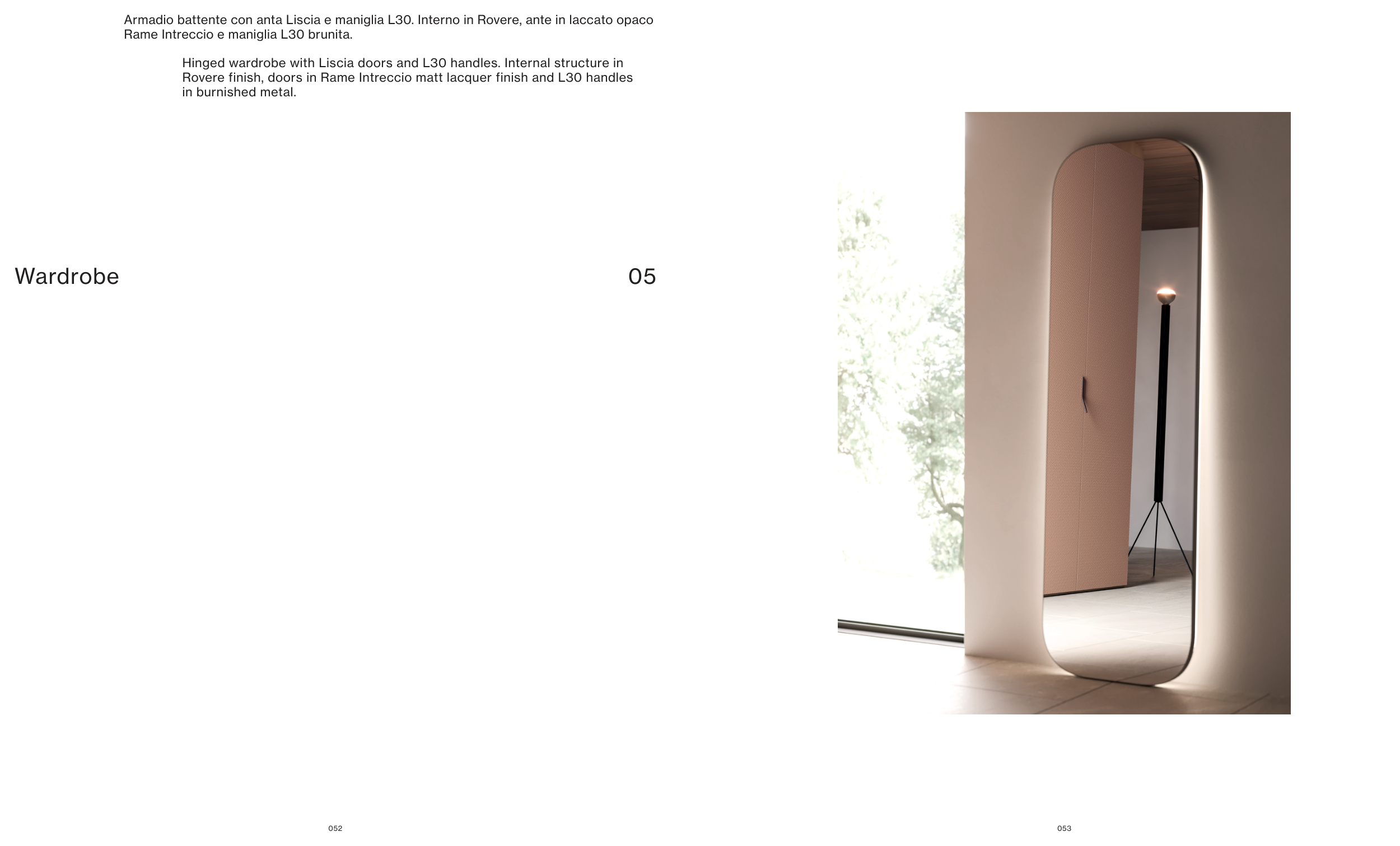 Rovere finish, doors in Rame Intreccio matt lacquer finish and L30 handles