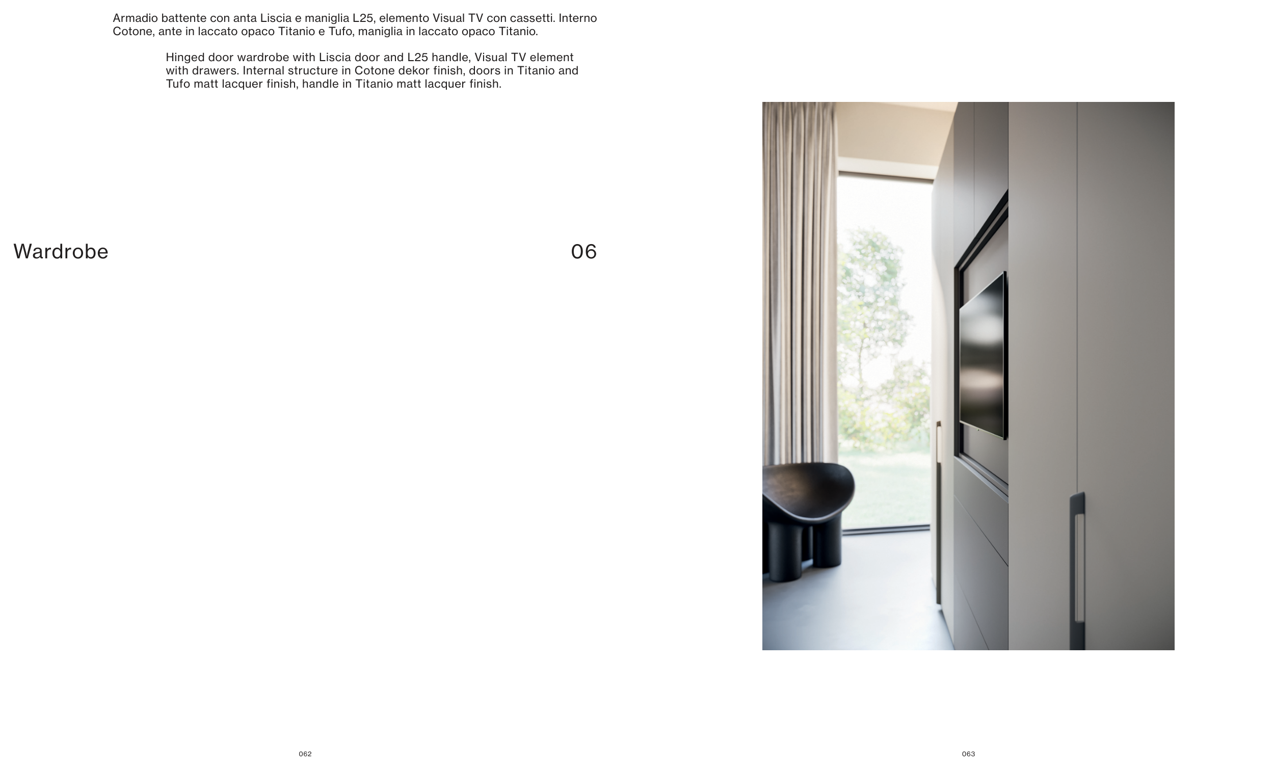 with drawers. Internal structure in Cotone dekor finish, doors in Titanio and