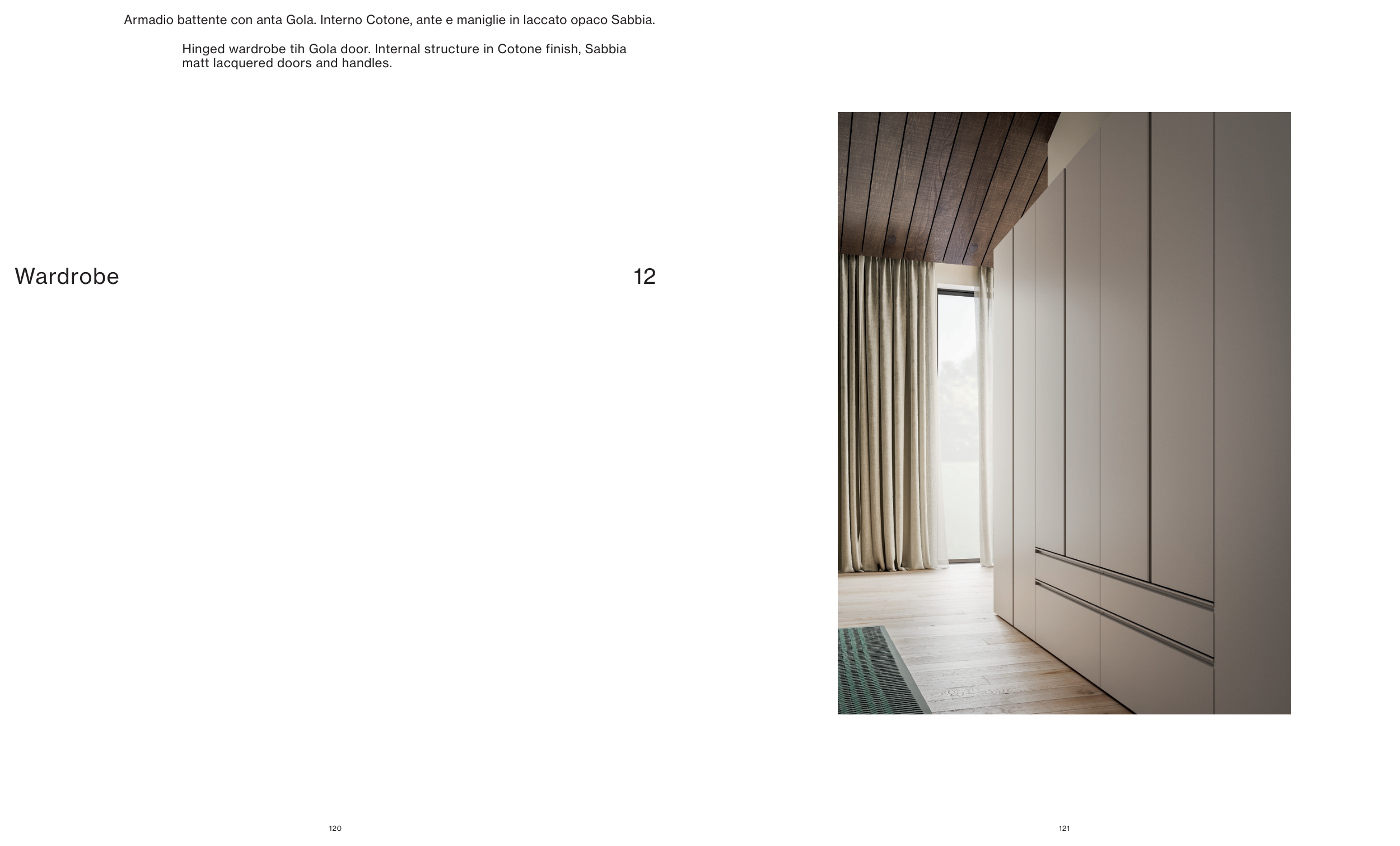 Hinged wardrobe tih Gola door. Internal structure in Cotone finish, Sabbia