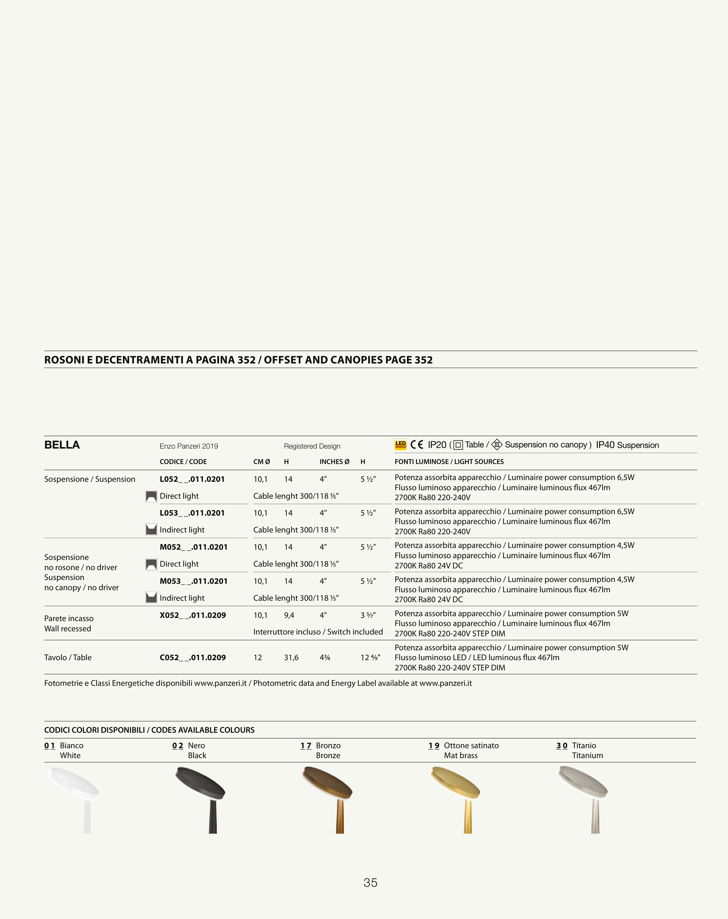 Fotometrie e Classi Energetiche disponibili www.panzeri.it / Photometric data and Energy Label available at www.panzeri.it