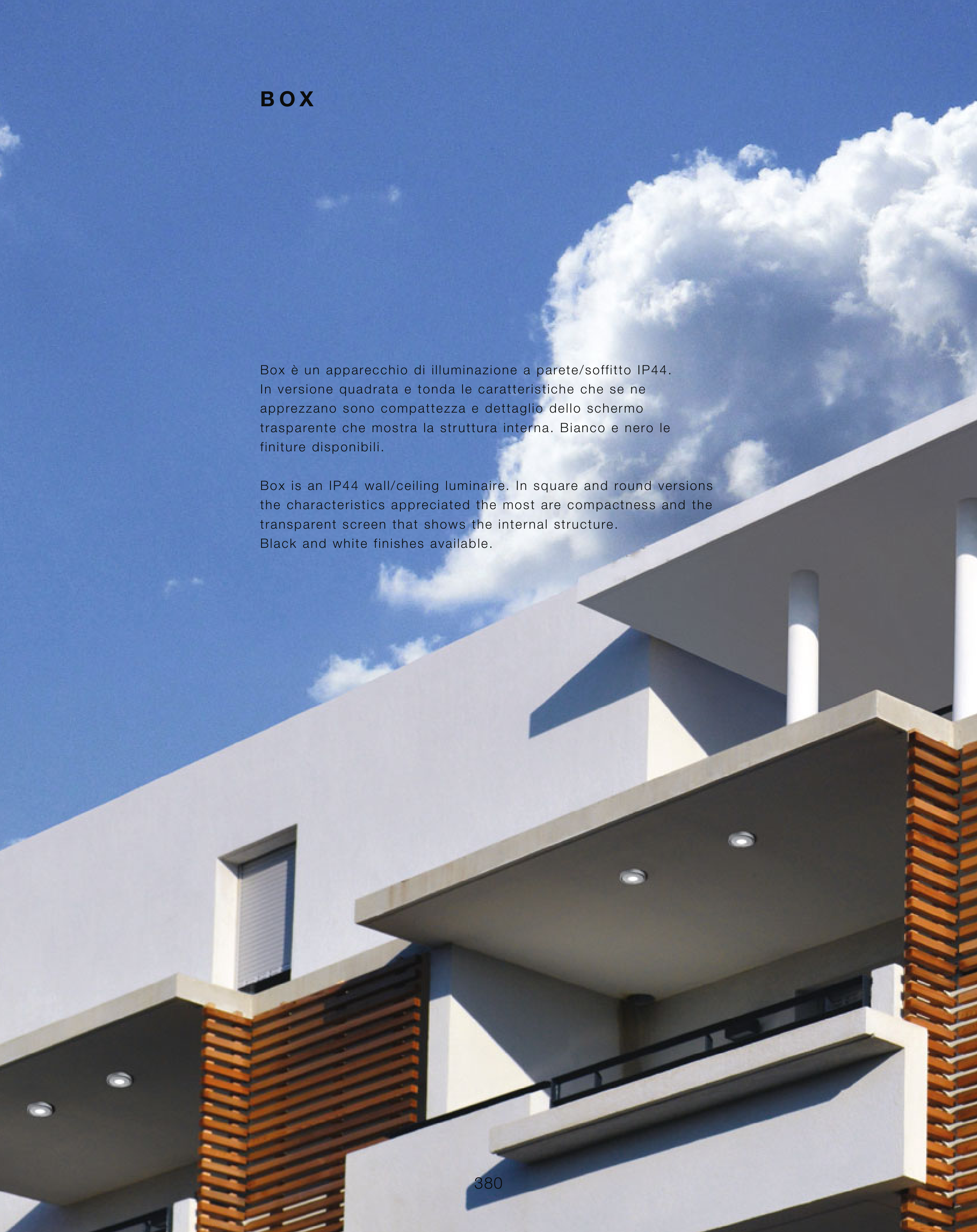 Box is an IP44 wall/ceiling luminaire. In square and round versions