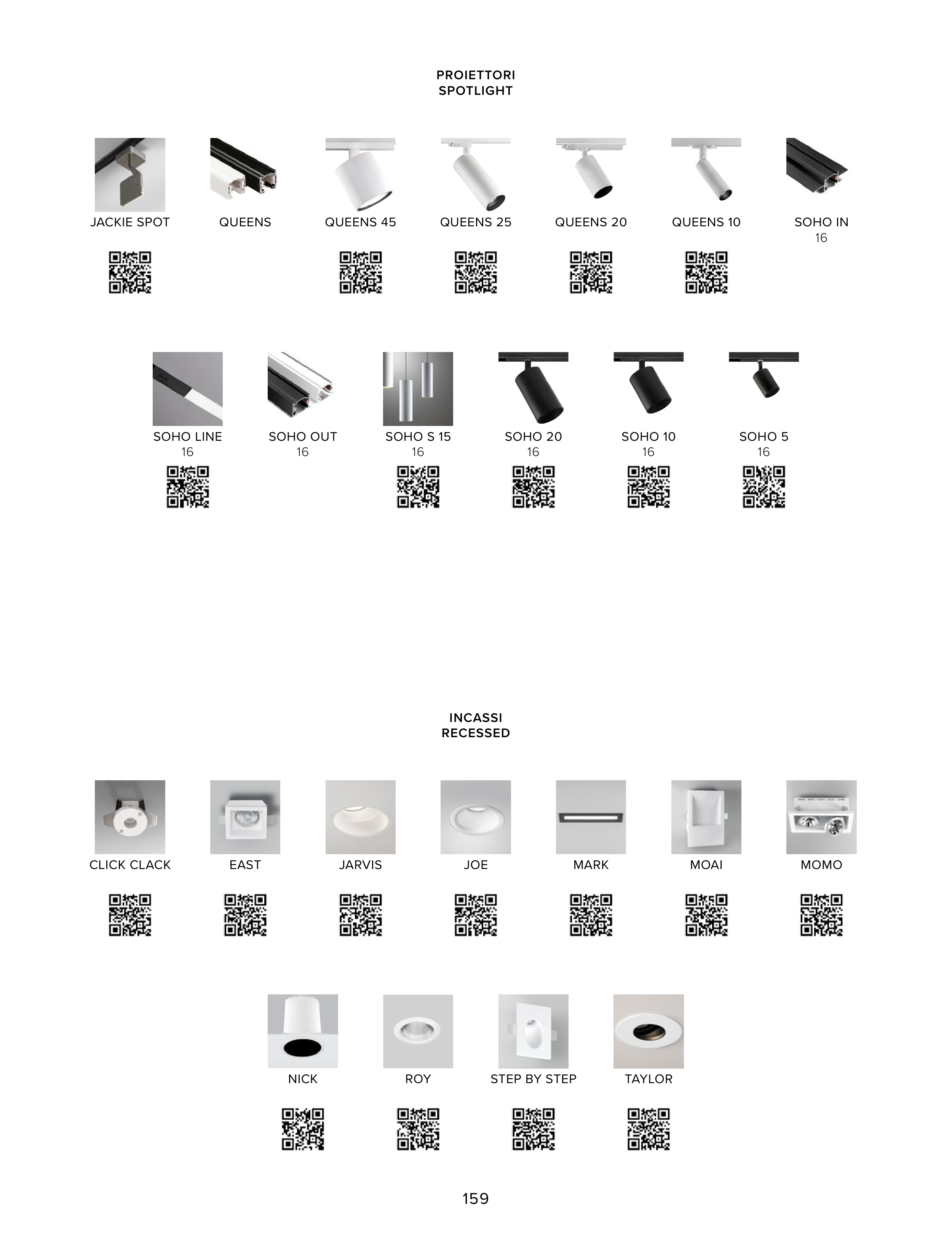 PROIETTORI SPOTLIGHT JACKIE SPOT QUEENS QUEENS 45 QUEENS 25 QUEENS 20 QUEENS 10 SOHO IN 16 SOHO LINE 16 SOHO OUT 16 SOHO S 15 16 SOHO 20 16 SOHO 10 16 SOHO 5 16 CLICK CLACK EAST JARVIS JOE MARK MOAI MOMO NICK ROY STEP BY STEP TAYLOR INCASSI RECESSED 159