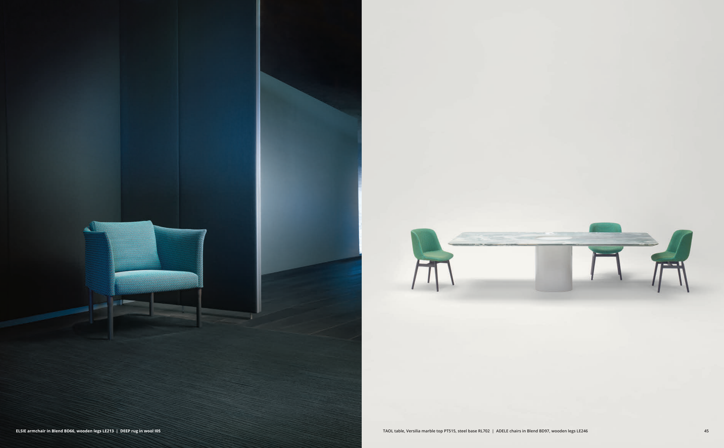 44 ELSIE armchair in Blend BD66, wooden legs LE213 | DEEP rug in wool I05 45 ELSIE armchair in Blend BD66, wooden legs LE213 | DEEP rug in wool I05 TAOL table, Versilia marble top PT515, steel base RL702 | ADELE chairs in Blend BD97, wooden legs LE246