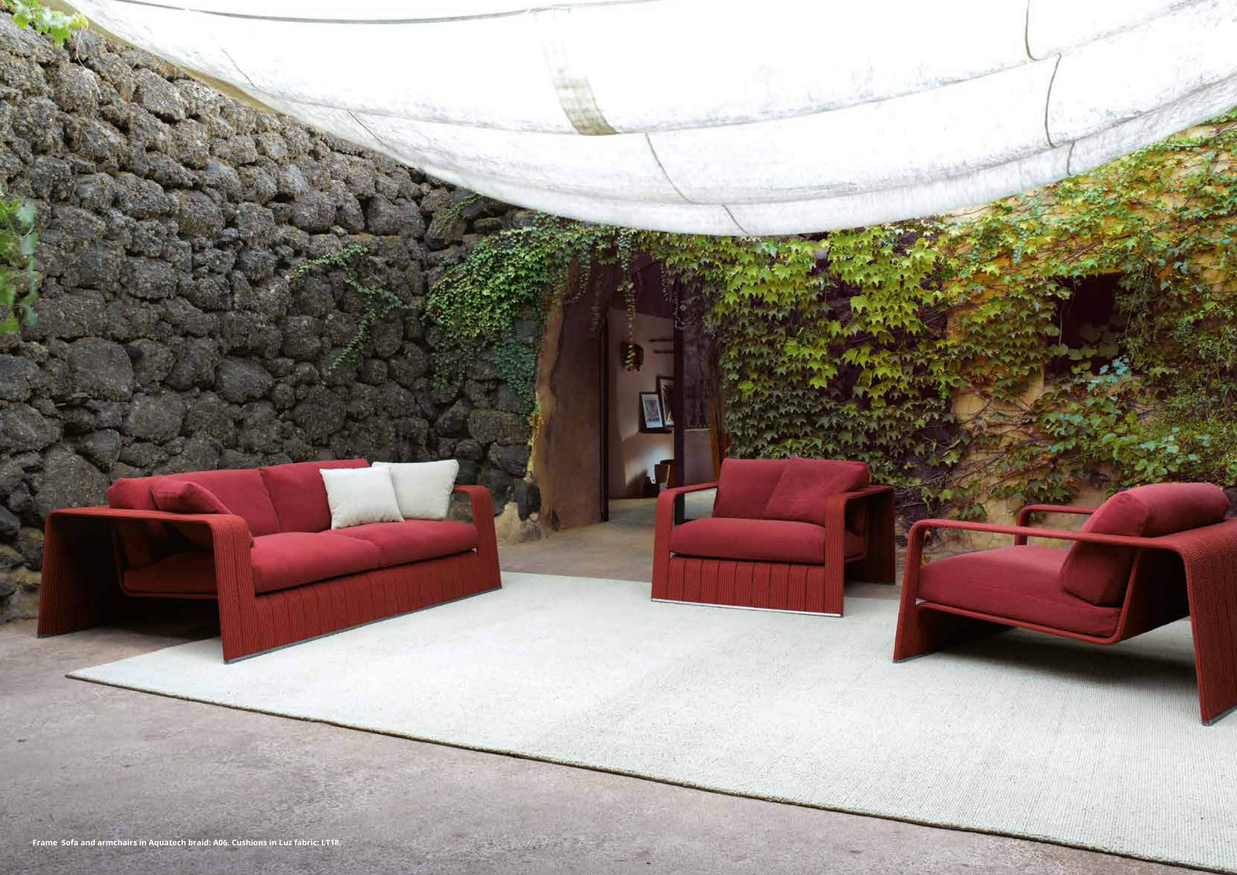 Frame Sofa and armchairs in Aquatech braid: A06. Cushions in Luz fabric: LT18.