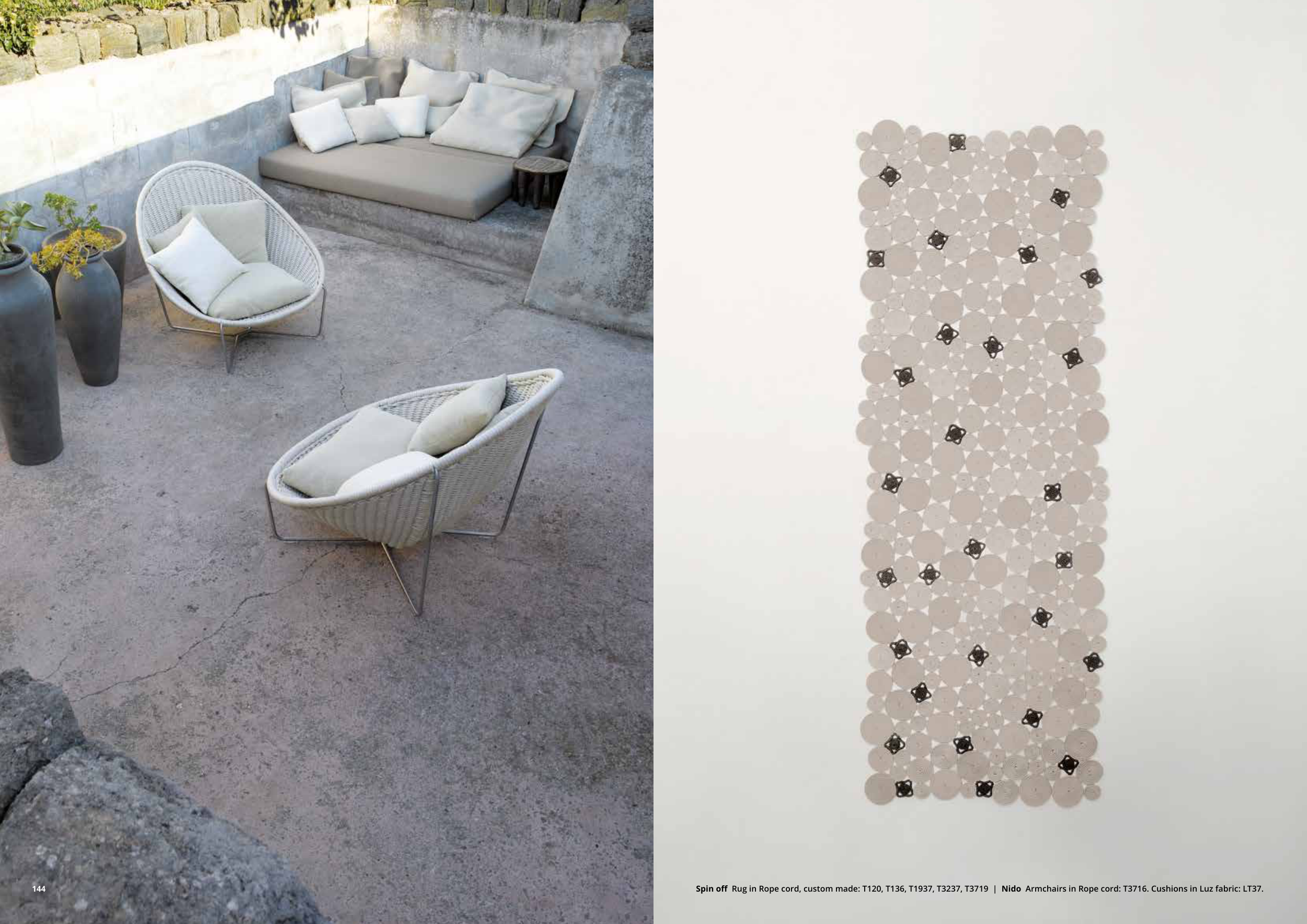 Spin off Rug in Rope cord, custom made: T120, T136, T1937, T3237, T3719 | Nido Armchairs in Rope cord: T3716. Cushions in Luz fabric: LT37.
