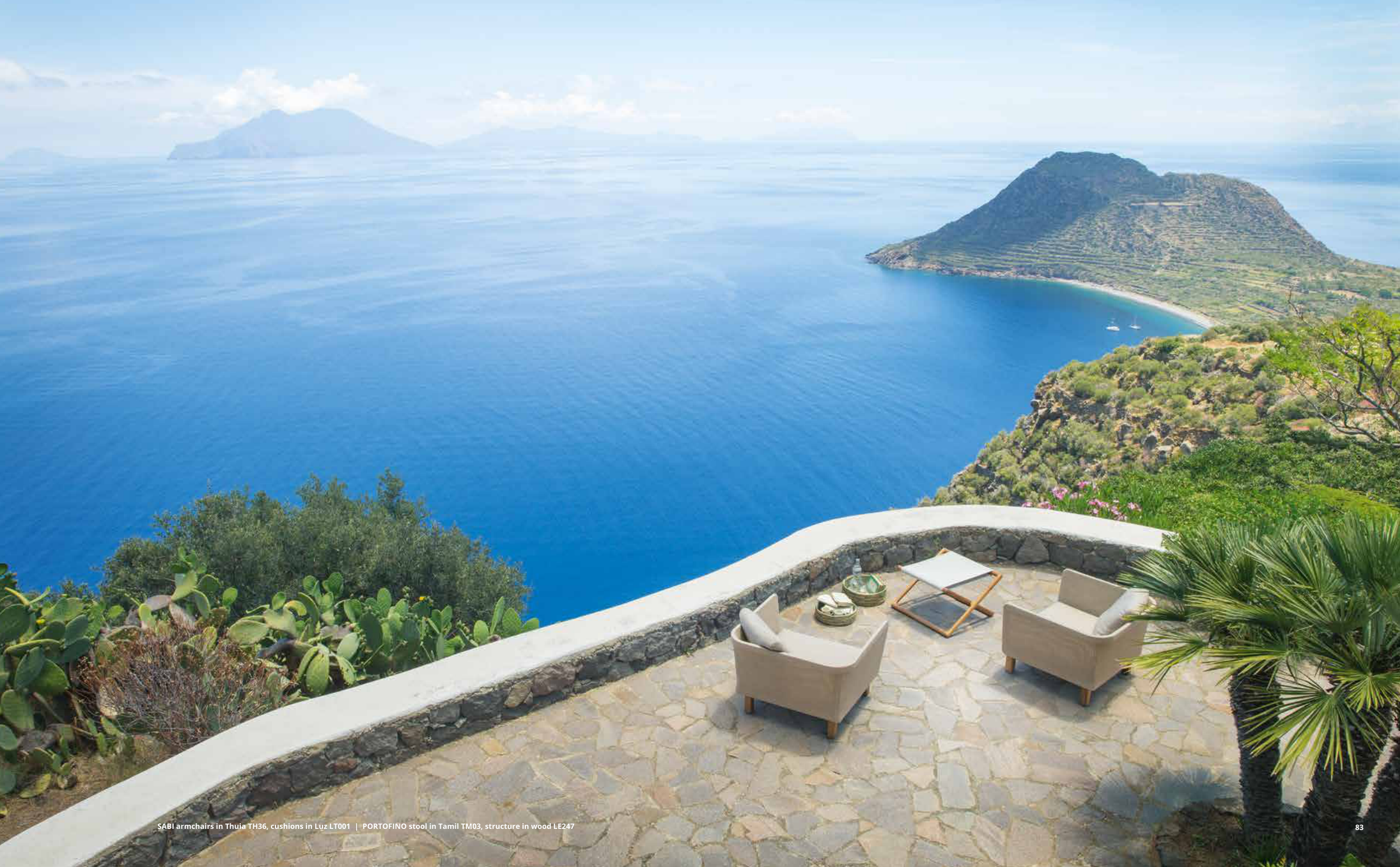 SABI armchairs in Thuia TH36, cushions in Luz LT001 | PORTOFINO stool in Tamil TM03, structure in wood LE247