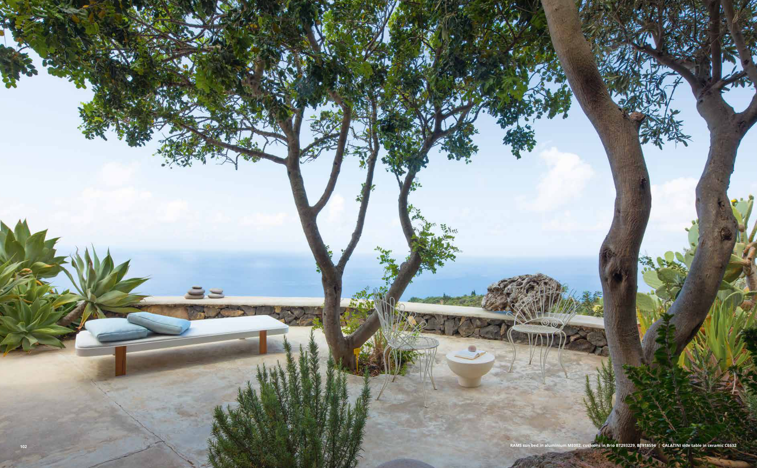 RAMS sun bed in aluminium ME002, cushions in Brio BT293229, BT918594 | CALATINI side table in ceramic CE632