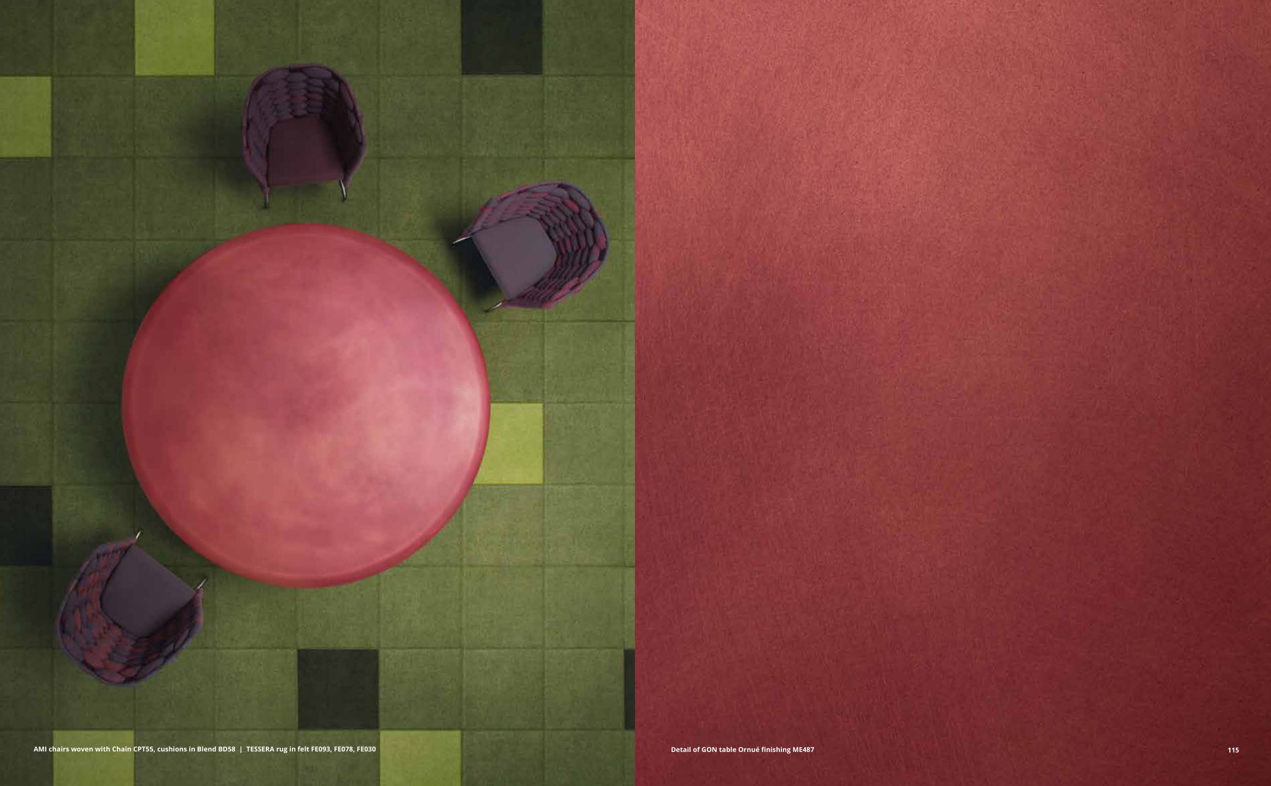 AMI chairs woven with Chain CPT55, cushions in Blend BD58 | TESSERA rug in felt FE093, FE078, FE030