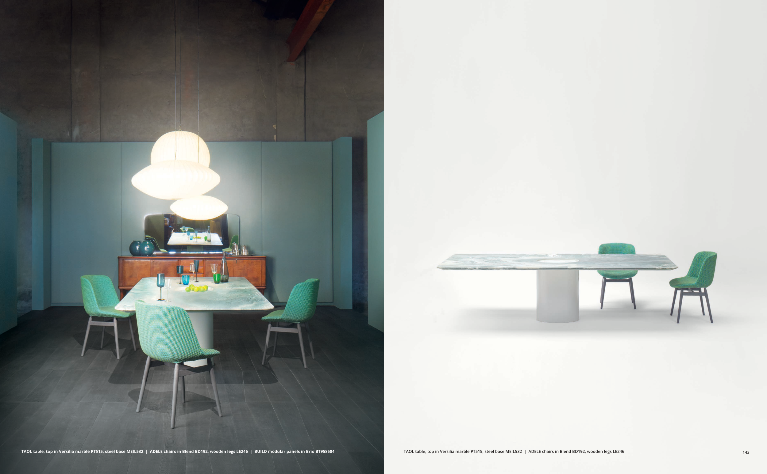TAOL table, top in Versilia marble PT515, steel base MEIL532 | ADELE chairs in Blend BD192, wooden legs LE246 | BUILD modular panels in Brio BT958584