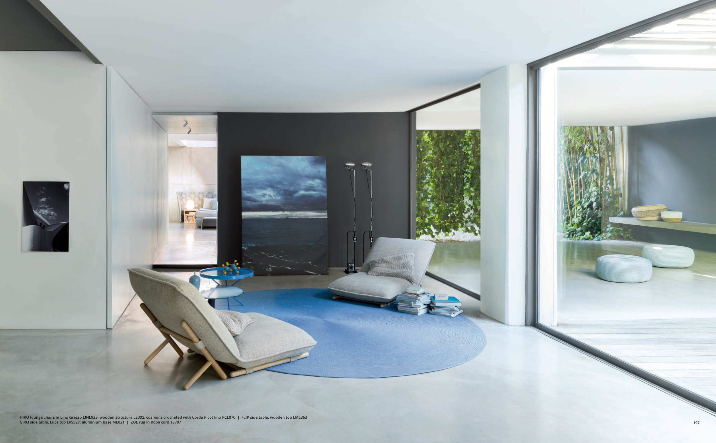 HIRO lounge chairs in Lino Grezzo LINL923, wooden structure LE002, cushions crocheted with Corda Picot lino PCL070 | FLIP side table, wooden top LML363