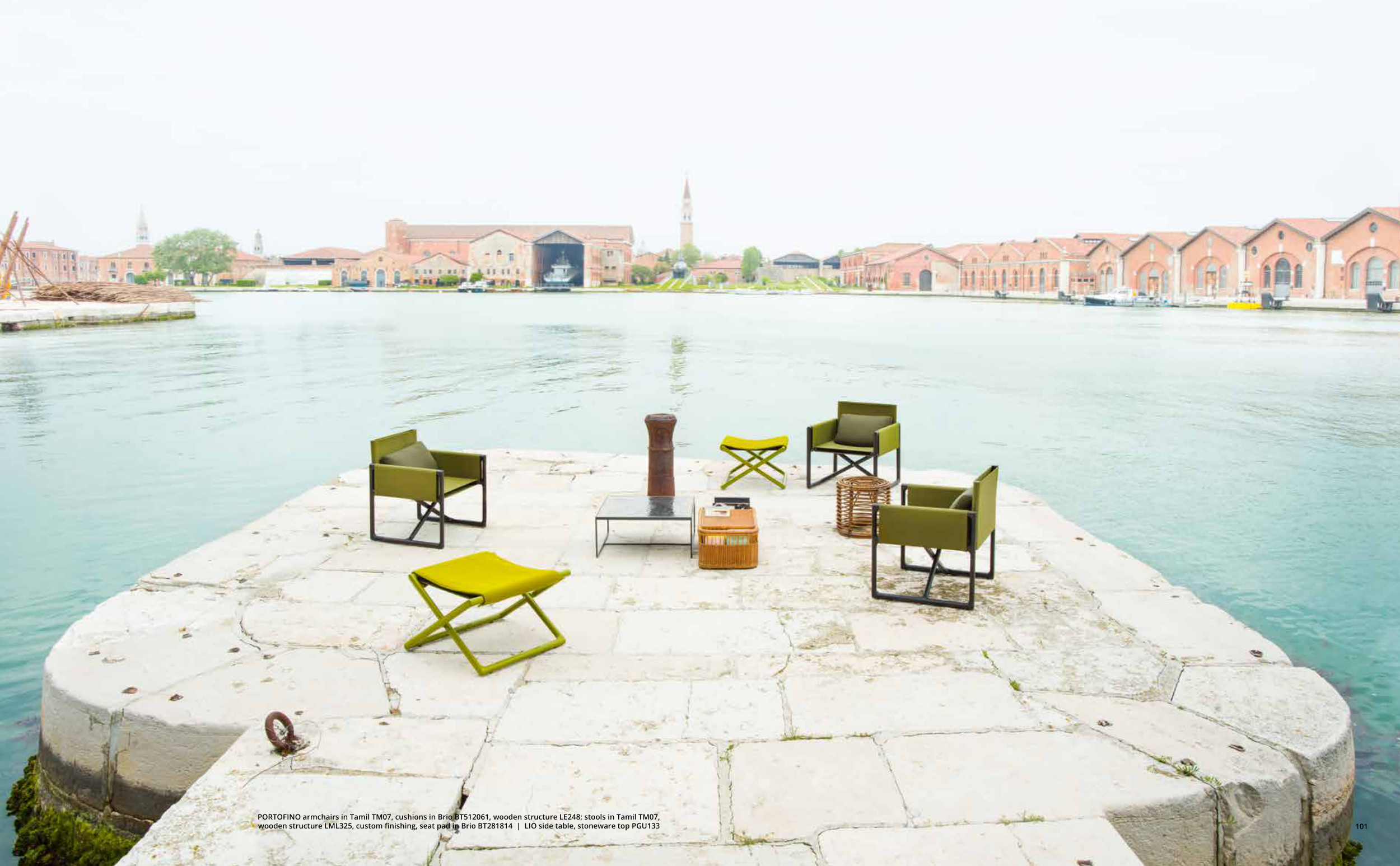 PORTOFINO armchairs in Tamil TM07, cushions in Brio BT512061, wooden structure LE248; stools in Tamil TM07,