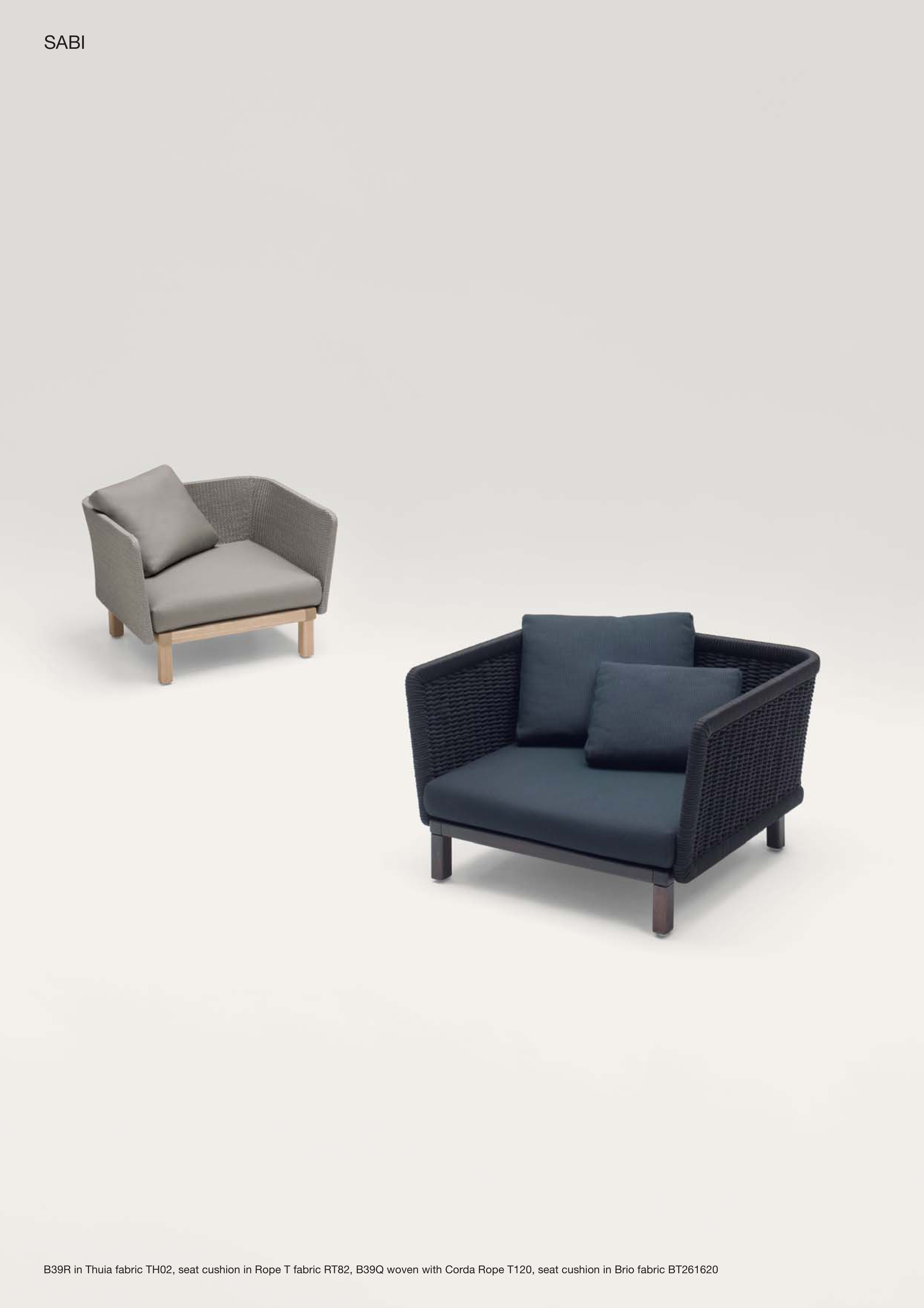 B39R in Thuia fabric TH02, seat cushion in Rope T fabric RT82, B39Q woven with Corda Rope T120, seat cushion in Brio fabric BT261620