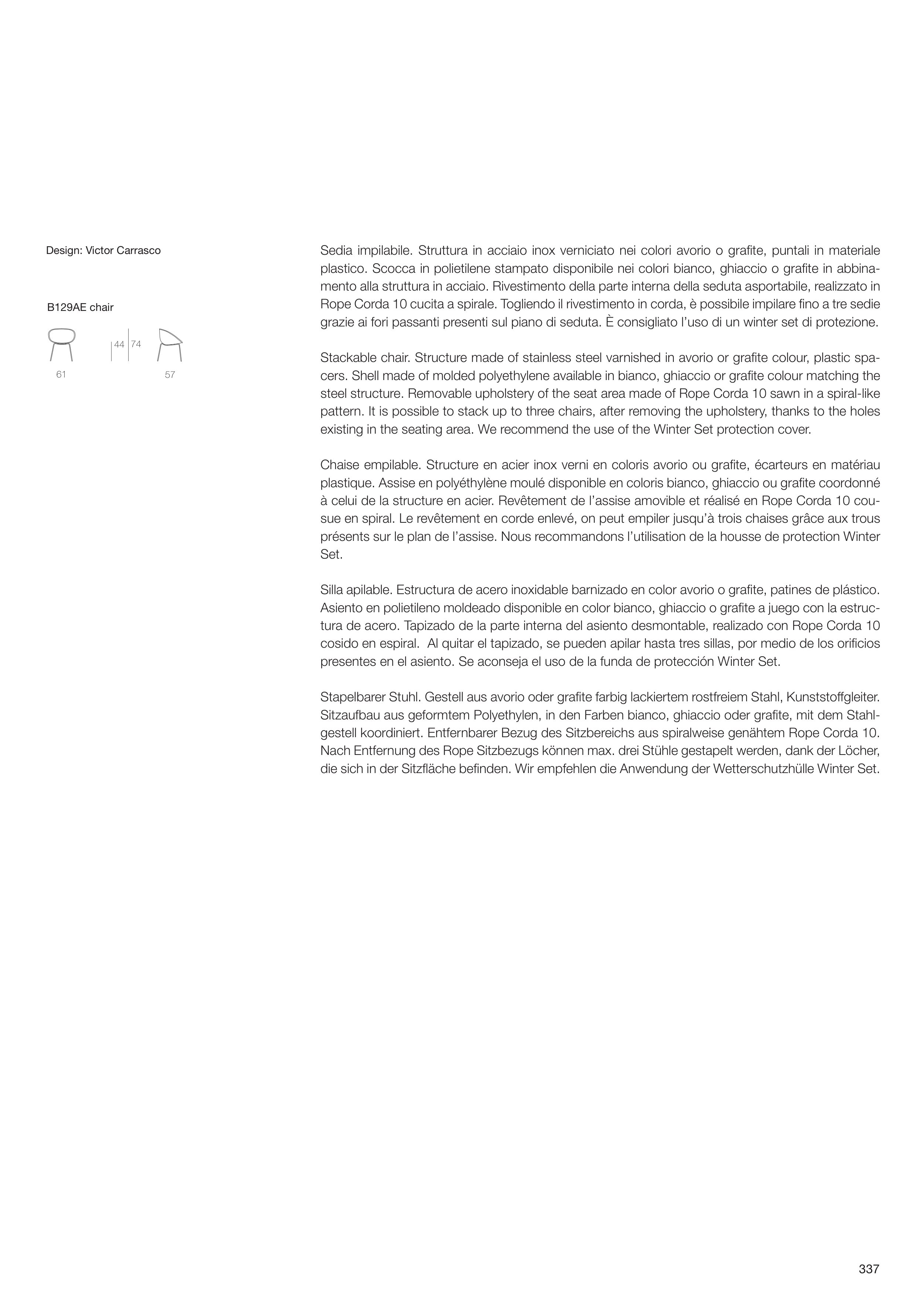 Silla apilable. Estructura de acero inoxidable barnizado en color avorio o grafi te, patines de plástico.