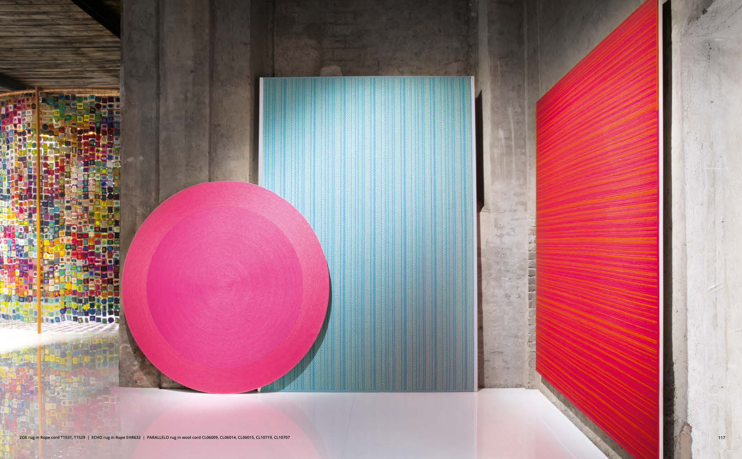 ZOE rug in Rope cord T1531, T1529 | ECHO rug in Rope EHR632 | PARALLELO rug in wool cord CL06009, CL06014, CL06015, CL10719, CL10707