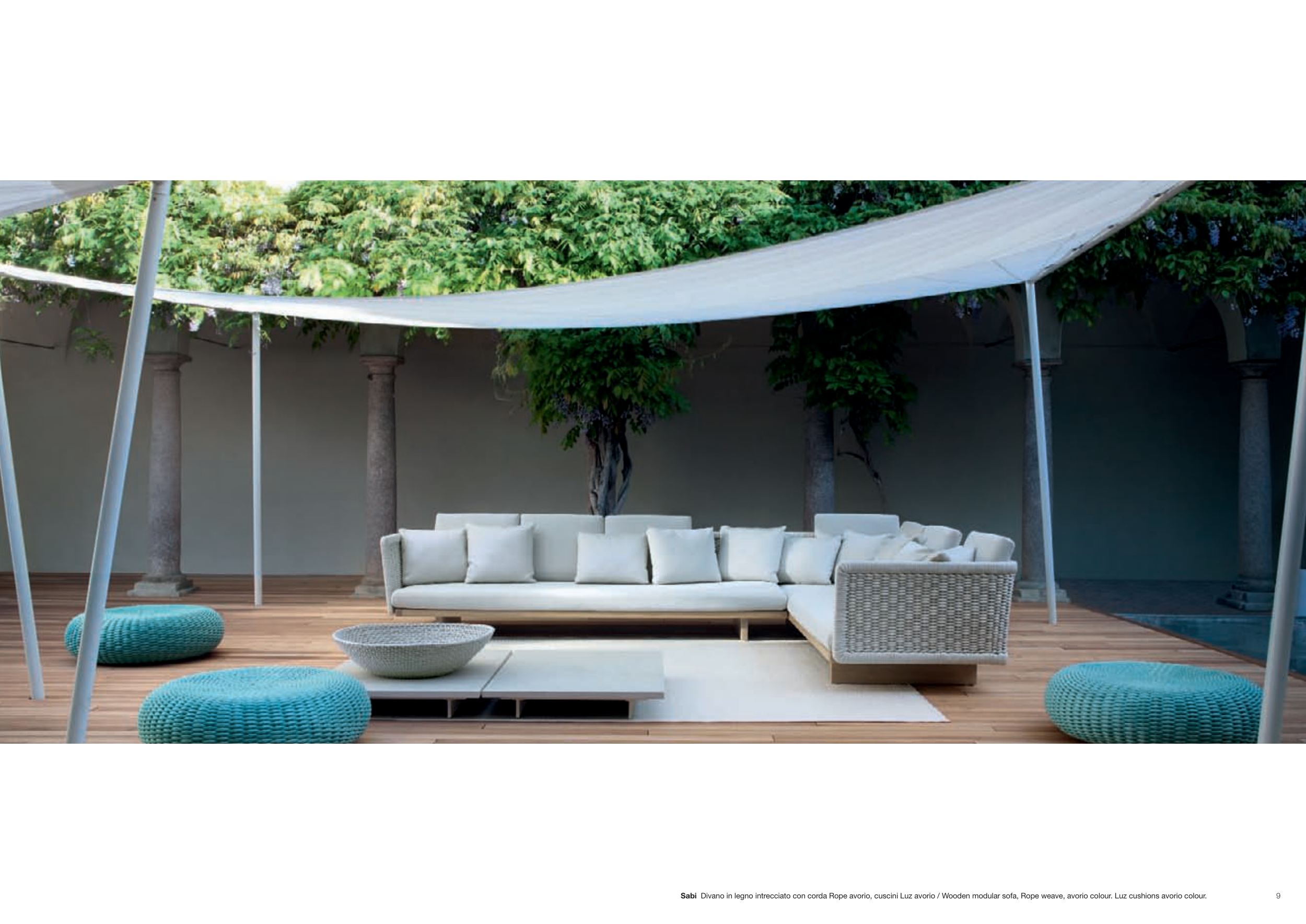 Sabi Divano in legno intrecciato con corda Rope avorio, cuscini Luz avorio / Wooden modular sofa, Rope weave, avorio colour. Luz cushions avorio colour.