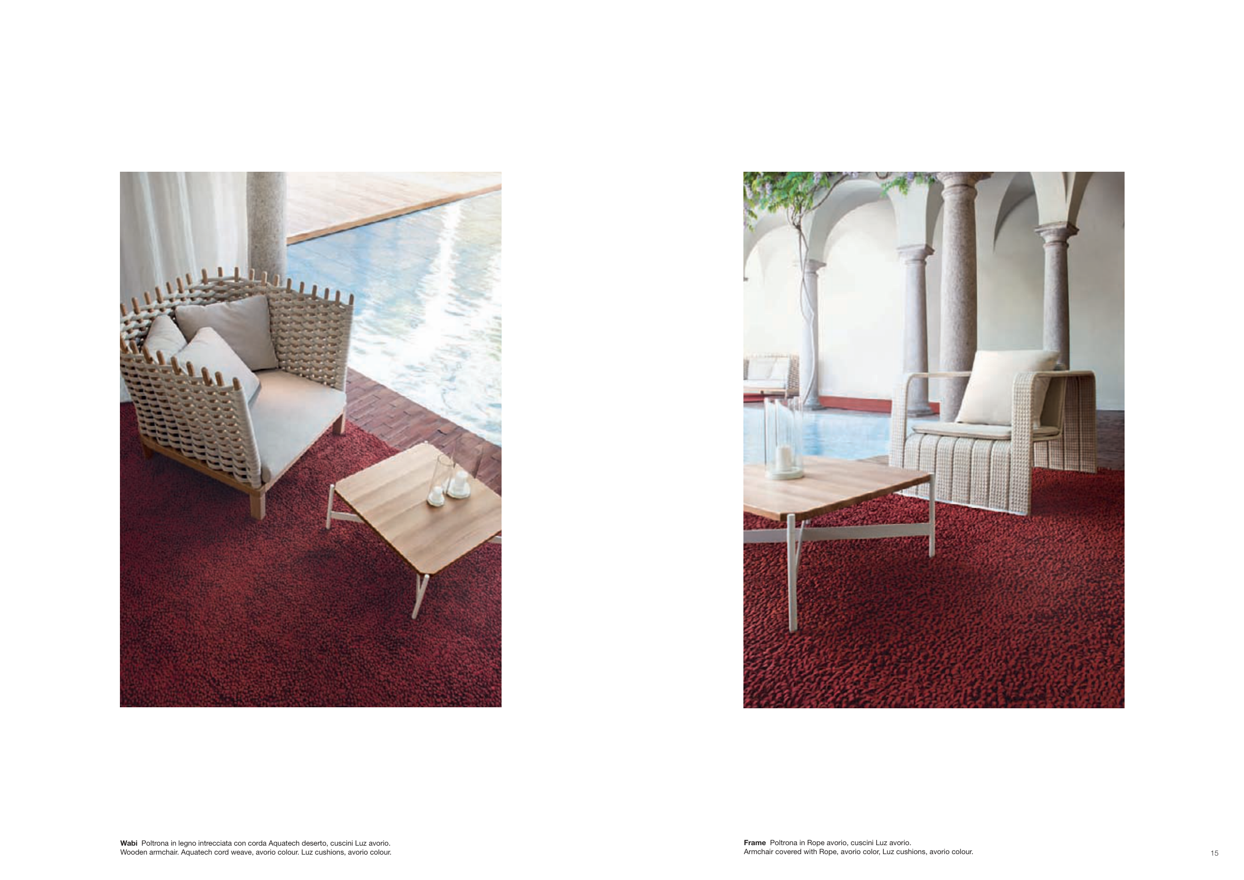 Wooden armchair. Aquatech cord weave, avorio colour. Luz cushions, avorio colour.