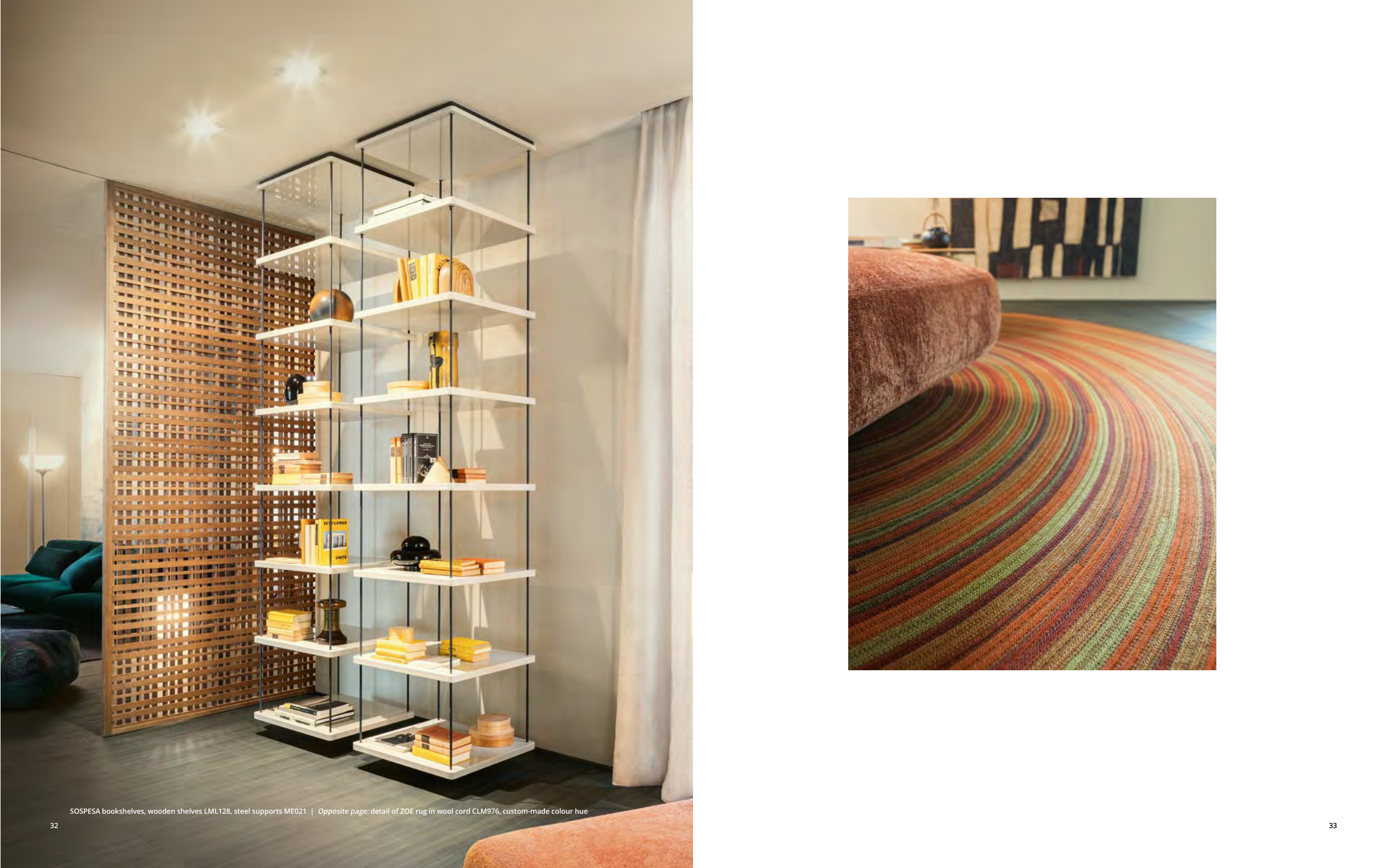 SOSPESA bookshelves, wooden shelves LML128, steel supports ME021 | Opposite page: detail of ZOE rug in wool cord CLM976, custom-made colour hue