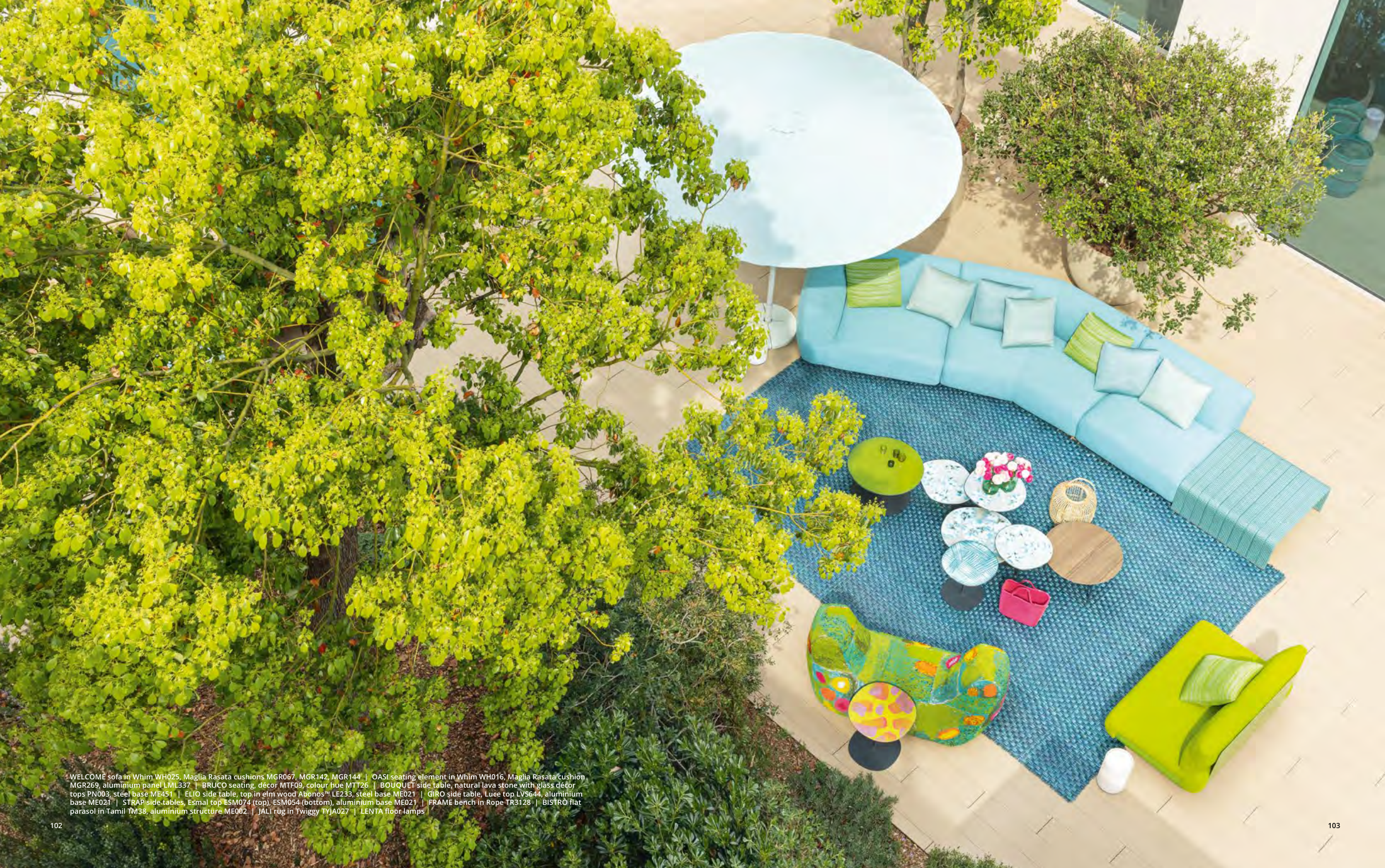 base ME021 | STRAP side tables, Esmal top ESM074 (top), ESM054 (bottom), aluminium base ME021 | FRAME bench in Rope TR3128 | BISTRÒ flat