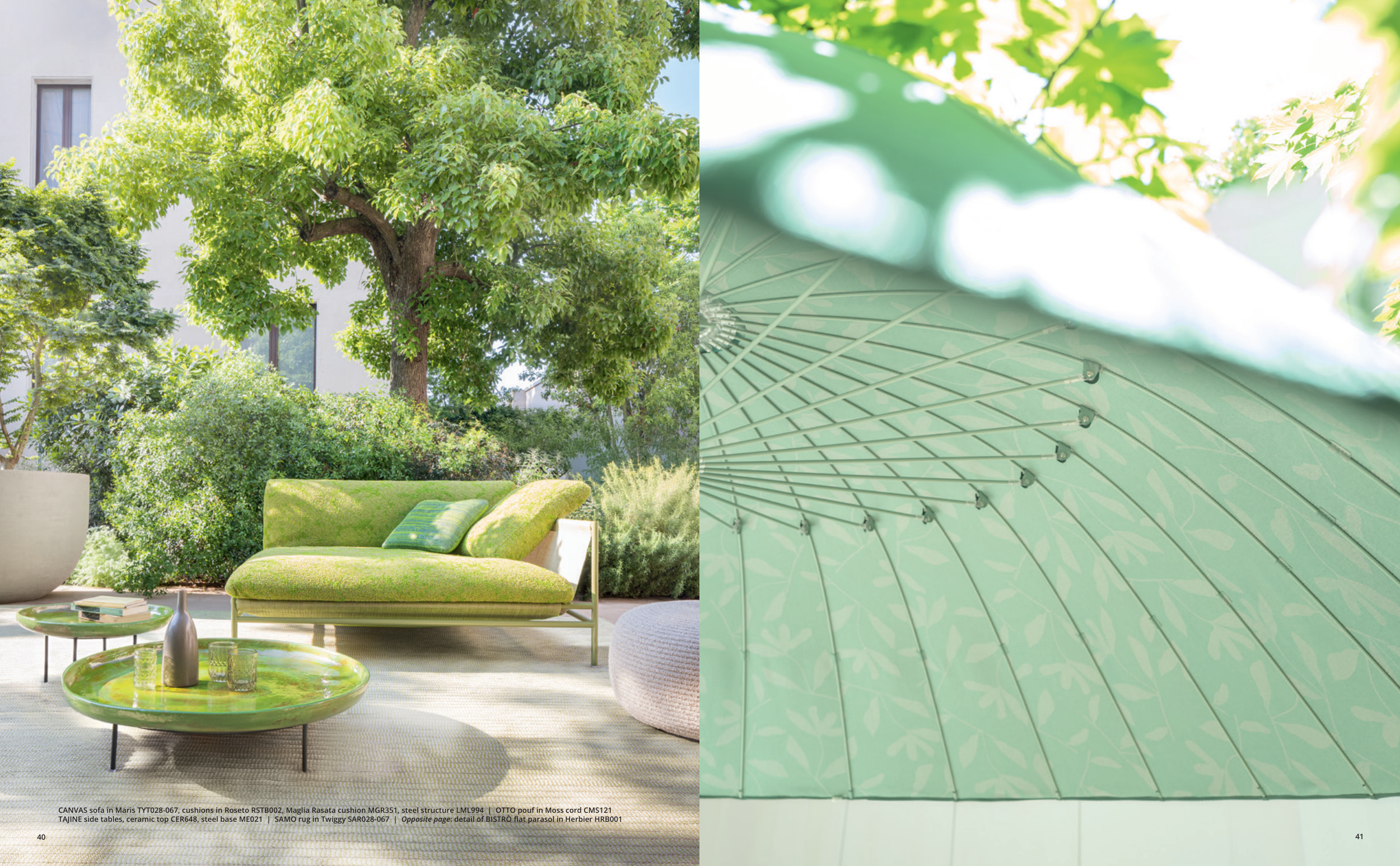 TAJINE side tables, ceramic top CER648, steel base ME021 | SAMO rug in Twiggy SAR028-067 | Opposite page: detail of BISTRÒ flat parasol in Herbier HRB001