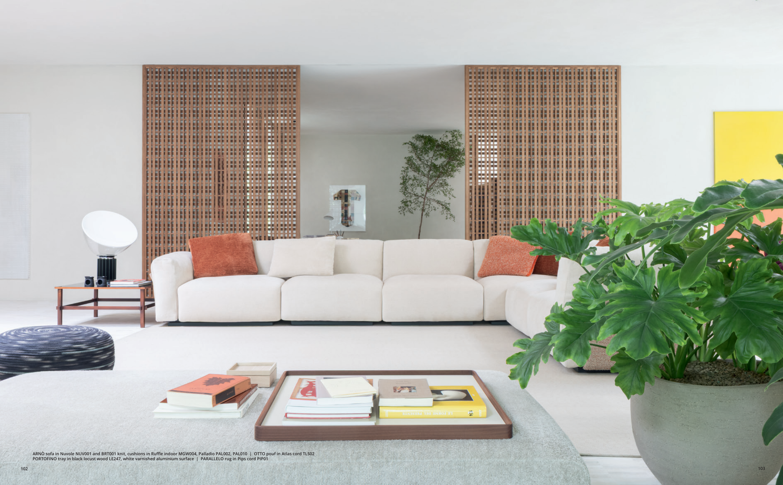ARNÒ sofa in Nuvole NUV001 and BRT001 knit, cushions in Ruffle indoor MGW004, Palladio PAL002, PAL010 | OTTO pouf in Atlas cord TLS02